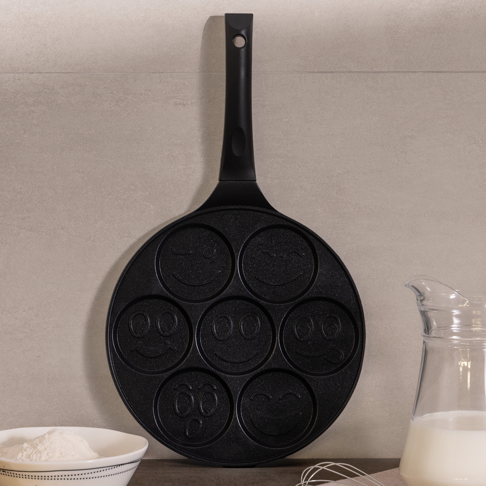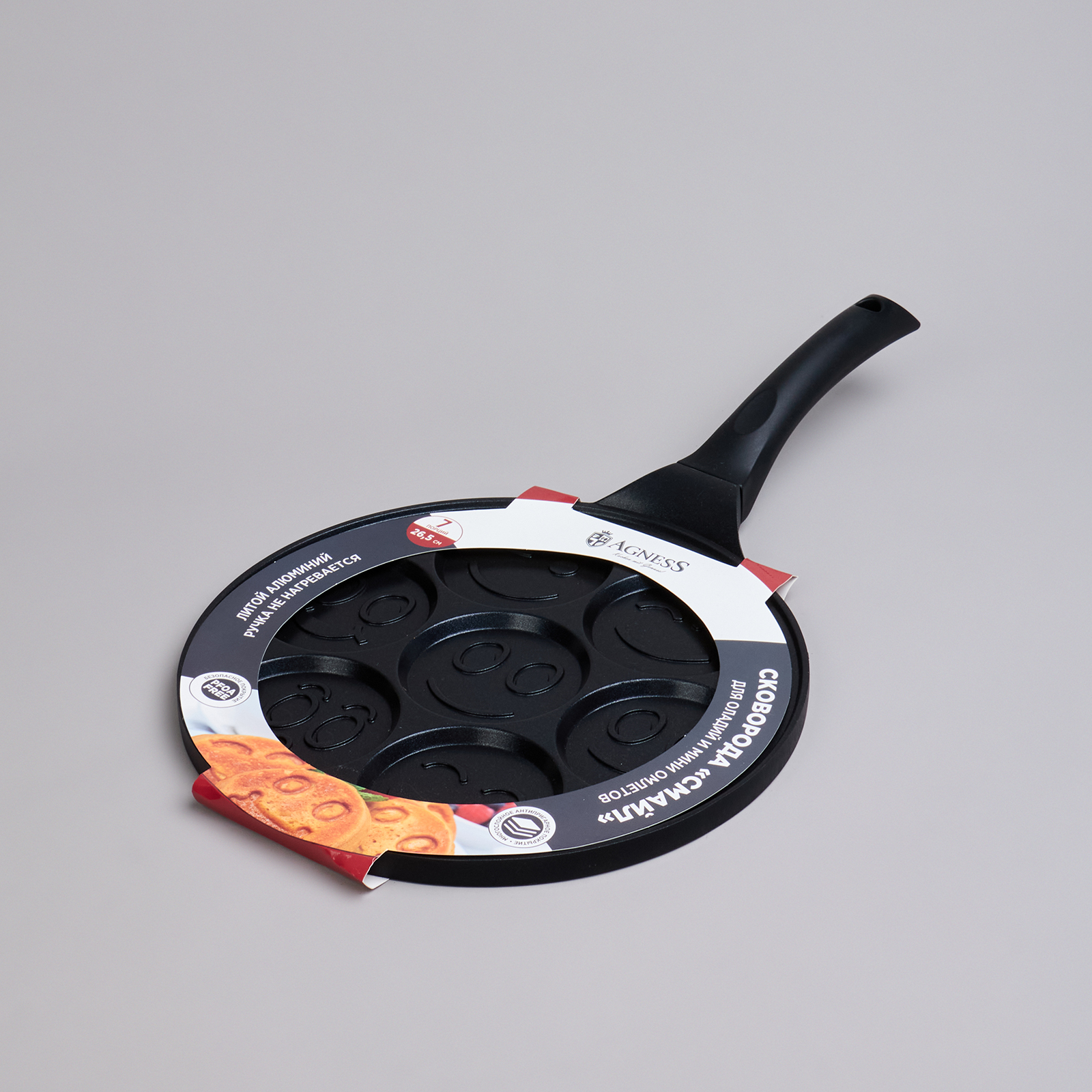 Сковороды AGNESS серии "СМАЙЛ" выполнены из литого алюминия. Такая посуда отличается высокой теплопроводностью и устойчивостью к деформациям. Необычный дизайн сковороды позволит приготовить интересные и веселые оладушки и омлеты.