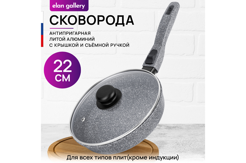 Глубокая сковорода Elan Gallery "Серый мрамор" с крышкой и съёмной ручкой из серии "Гармония вкуса" диаметром 22 см равномерно разогревается и распределяет тепло, поэтому продукты в ней сохраняют полезные свойства и сочность. Диаметр дна — 16 см. Стильный дизайн подойдет к любому интерьеру кухни. Подходит для приготовления стейков из рыбы, мяса или блюд из овощей. Сковорода с глубоким дном выполнена из толстостенного литого алюминия и имеет ультрапрочное двухслойное антипригарное покрытие Cookmark. Оно устойчиво к царапинам и износу, безопасно для здоровья и не содержит PFOA или других вредных веществ. Используйте для жарки котлет или картофеля с минимальным количеством масла. Здоровую пищу оценит любой гурман! Готовьте на завтрак оладьи или блюда из яиц: яичницу, омлет. Порадуйте близких большой порцией блинов на Масленицу, ни один блинчик не подгорит. Алюминиевая сковородка с толстым дном имеет удобную ручку, которая обеспечивает надежный захват при подаче еды с плиты на стол. Без крышки и ручки можно использовать в духовом шкафу как форму для запекания при температуре до 250°C. Не использовать съёмную ручку, чтобы достать раскалённую сковороду из духовой печи! Приготовьте румяную курочку в духовке и порадуйте своих близких. Эксплуатация: не нагревать без продуктов. Дайте посуде остыть, прежде чем помещать ее в воду. Использовать только деревянные, силиконовые и пластиковые лопатки без острых краёв. Не мыть абразивными или щелочными моющими средствами. Использовать в ПММ в режиме "Эко" со средством, не содержащим щёлочи. Подходит для стеклокерамических, газовых и электрических плит. Не подходит для индукционных плит. Кухонная утварь станет приятным подарком для женщин на День Рождения, 8 Марта и придаст процессу приготовления пищи комфорта. Подарите универсальную вещь маме, подруге, сестре или бабушке. Хорошая сковорода – мечта любой хозяйки! Сковородка станет незаменимым инвентарем на вашей кухне и наполнит процесс приготовления пищи удовольствием! /