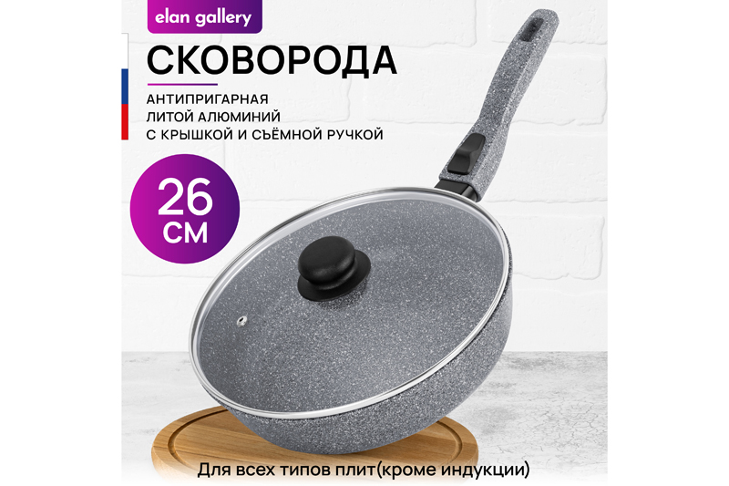 Глубокая сковорода Elan Gallery "Серый мрамор" с крышкой и съёмной ручкой из серии "Гармония вкуса" диаметром 26 см равномерно разогревается и распределяет тепло, поэтому продукты в ней сохраняют полезные свойства и сочность. Диаметр дна — 18 см. Стильный дизайн подойдет к любому интерьеру кухни. Подходит для приготовления стейков из рыбы, мяса или блюд из овощей. Сковорода с глубоким дном выполнена из толстостенного литого алюминия и имеет ультрапрочное двухслойное антипригарное покрытие Cookmark. Оно устойчиво к царапинам и износу, безопасно для здоровья и не содержит PFOA или других вредных веществ. Используйте для жарки котлет или картофеля с минимальным количеством масла. Здоровую пищу оценит любой гурман! Готовьте на завтрак оладьи или блюда из яиц: яичницу, омлет. Порадуйте близких большой порцией блинов на Масленицу, ни один блинчик не подгорит. Алюминиевая сковородка с толстым дном имеет удобную ручку, которая обеспечивает надежный захват при подаче еды с плиты на стол. Без крышки и ручки можно использовать в духовом шкафу как форму для запекания при температуре до 250°C. Не использовать съёмную ручку, чтобы достать раскалённую сковороду из духовой печи! Приготовьте румяную курочку в духовке и порадуйте своих близких. Эксплуатация: не нагревать без продуктов. Дайте посуде остыть, прежде чем помещать ее в воду. Использовать только деревянные, силиконовые и пластиковые лопатки без острых краёв. Не мыть абразивными или щелочными моющими средствами. Использовать в ПММ в режиме "Эко" со средством, не содержащим щёлочи. Подходит для стеклокерамических, газовых и электрических плит. Не подходит для индукционных плит. Кухонная утварь станет приятным подарком для женщин на День Рождения, 8 Марта и придаст процессу приготовления пищи комфорта. Подарите универсальную вещь маме, подруге, сестре или бабушке. Хорошая сковорода – мечта любой хозяйки! Сковородка станет незаменимым инвентарем на вашей кухне и наполнит процесс приготовления пищи удовольствием! /