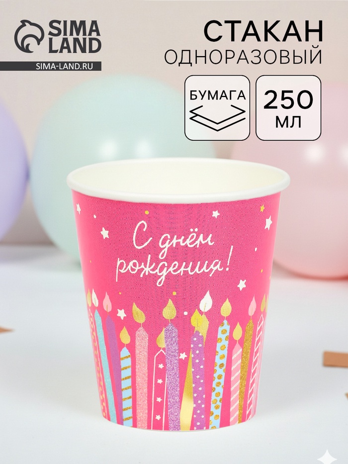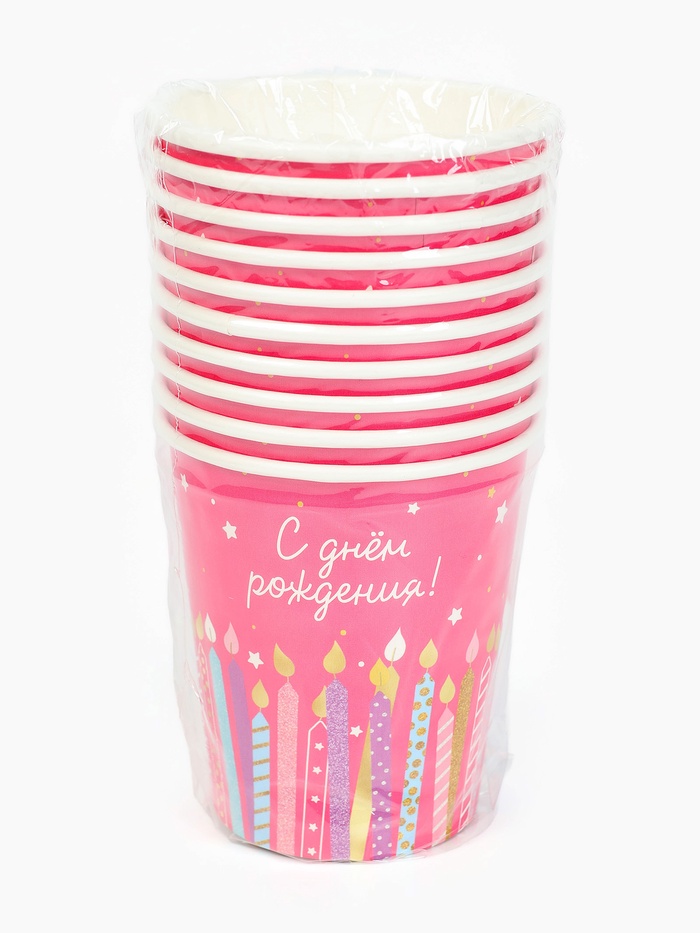 Стакан одноразовый бумажный «С Днём рождения», розовый, 250 мл