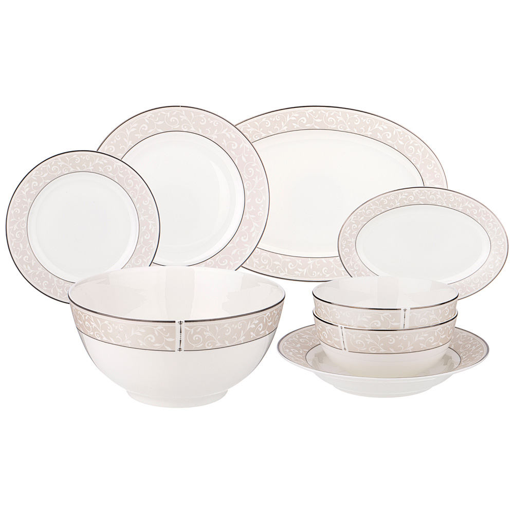 ТМ LEFARD предлагает коллекции столовой посуды из костяного фарфора. "5 o'clock" не оставит равнодушным и украсит любой праздничный стол. Ваш стол стильный, элегантный, с изящным орнаментом и тонкой золотой полосой по краю. 45 % костной золы. Изделия тонкие, прочные и прозрачные. Фарфор мягкого молочного цвета. Изготовление изделий из костяного фарфора не поддаётся автоматизации, производство таких вещей возможно только с использованием ручного труда. Не рекомендуется использовать в микроволной печи, мыть в посудомоечной машине. Комплектность: тарелка обеденная 25,5 см 6 шт., тарелка закусочная 20,5 см 6 шт., тарелка суповая 23 см 6 шт., салатник 23 см 1750 мл, салатник 16 см 750 мл 2 шт., блюдо овальное 36 см, блюдо овальное 23 см.