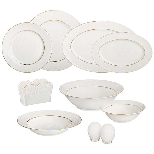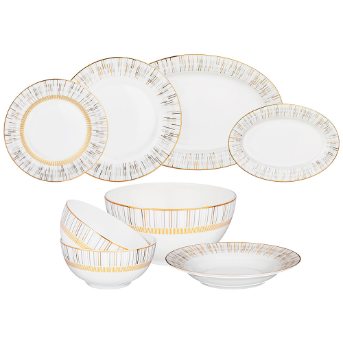 Комплектность: тарелка обеденная 25,5 см 6 шт., тарелка закусочная 20,5 см 6 шт., тарелка суповая 23 см 6 шт., салатник 23 см 1750 мл, салатник 16 см 750 мл 2 шт., блюдо овальное 36 см. блюдо овальное 23 см.