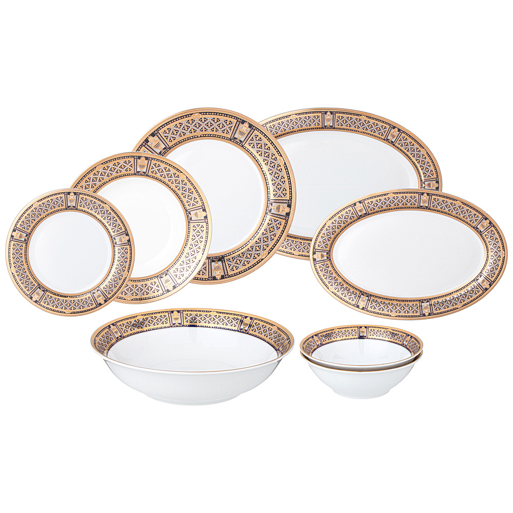 Комплектность: блюдо овальное 36*24,5 см - 1 шт., блюдо овальное 31*21 см - 1 шт., тарелка обеденная 27 см - 6 шт., тарелка закусочная 20,5 см - 6 шт., тарелка супова 24*4 см - 6 шт., салатник 23*6 см - 1 шт., салатник 14*4,5 см - 2 шт.
