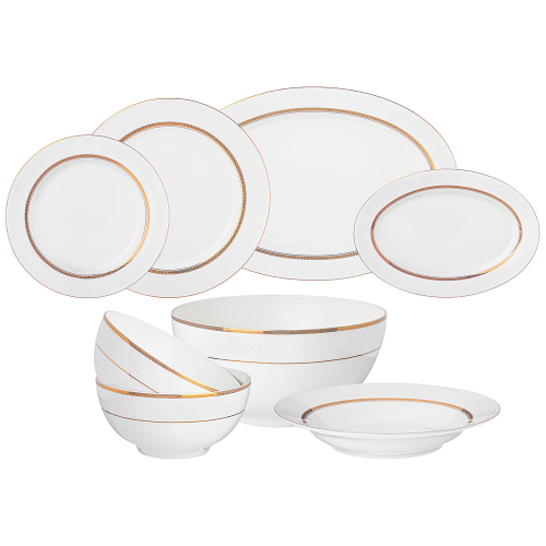 Комплектность: 6 обеденных тарелок 25,5*2 см, 6 суповых тарелок 300 мл 23*3,8 см, 6 закусочных тарелок 20,5*2 см, 2 овальных блюда 35,5*25*3 см и 26*18,5*2,2 см , салатник 1900 мл 23*6,5 см, 2 салатника 300 мл 11,4*5,6 см