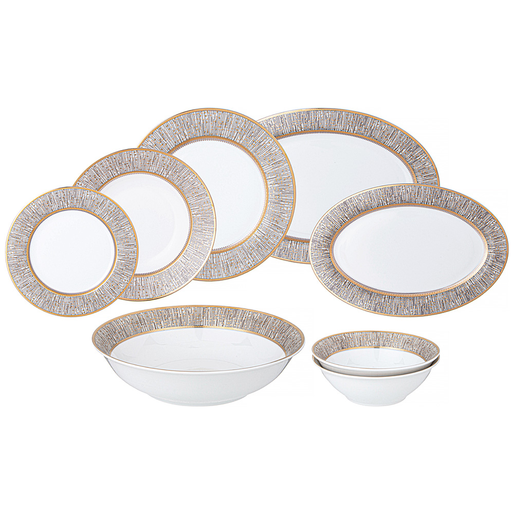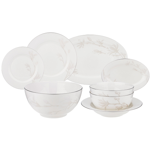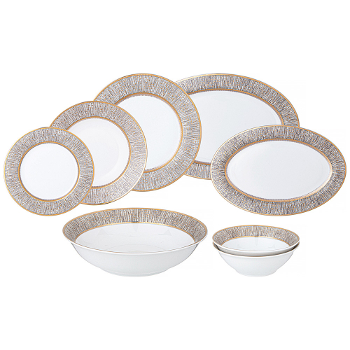 Комплектность: блюдо овальное 36*24,5 см - 1 шт., блюдо овальное 31*21 см - 1 шт., тарелка обеденная 27 см - 6 шт., тарелка закусочная 20,5 см - 6 шт., тарелка супова 24*4 см - 6 шт., салатник 23*6 см - 1 шт., салатник 14*4,5 см - 2 шт.