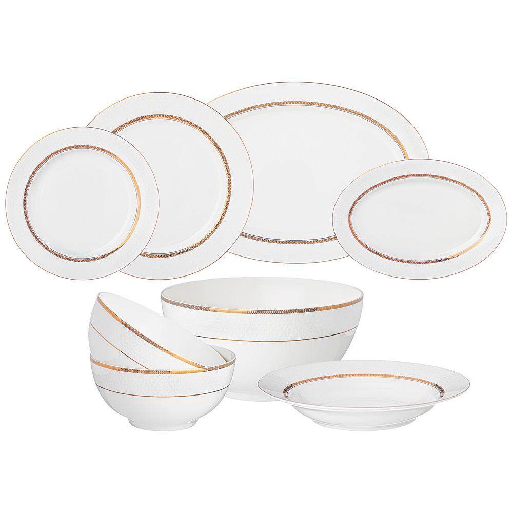 Комплектность: тарелка обеденная 25,5 см 6 шт., тарелка закусочная 20,5 см 6 шт., тарелка суповая 23 см 6 шт., салатник 23 см 1750 мл, салатник 16 см 750 мл 2 шт., блюдо овальное 36 см. блюдо овальное 23 см.