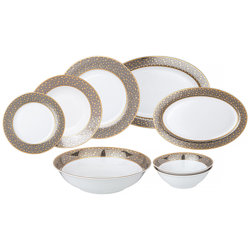Комплектность: блюдо овальное 36*24,5 см - 1 шт., блюдо овальное 31*21 см - 1 шт., тарелка обеденная 27 см - 6 шт., тарелка закусочная 20,5 см - 6 шт., тарелка супова 24*4 см - 6 шт., салатник 23*6 см - 1 шт., салатник 14*4,5 см - 2 шт.
