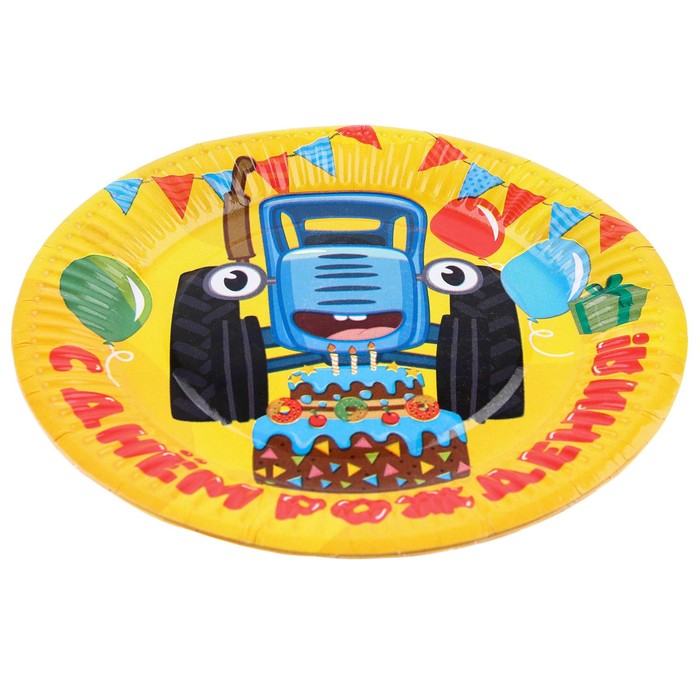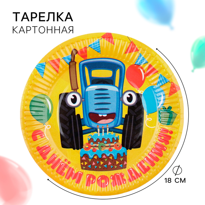 Тарелка одноразовая бумажная "С Днем Рождения!", 18 см, Синий трактор