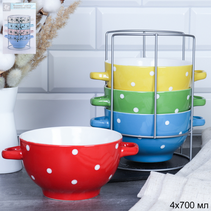 Бульонница с ручками 4 штуки на металлической подставке, керамика.