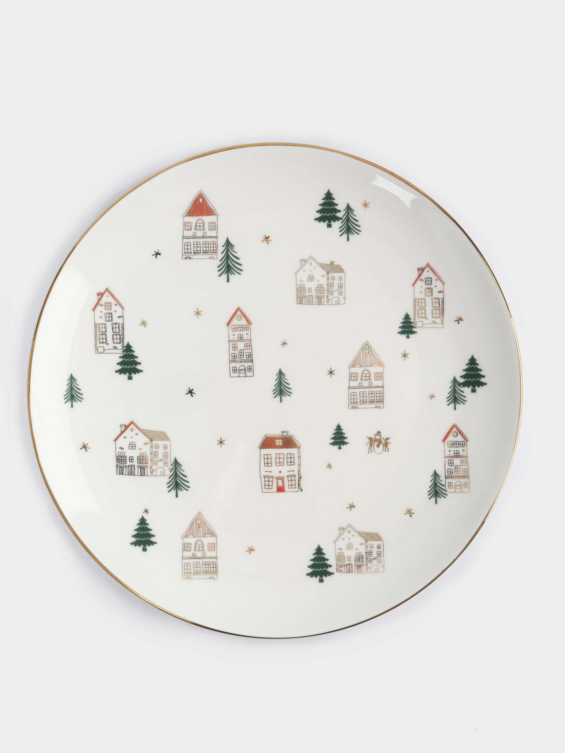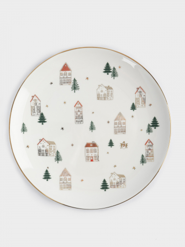 Тарелка обеденная, 27 см, фарфор N, бело-золотистая, Домики и ели, Townlet
