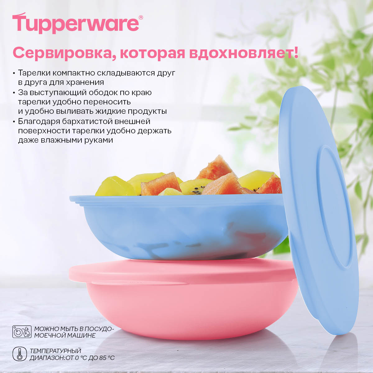 Внутренняя поверхность тарелок глянцевая, что обеспечивает лёгкий уход и перемешивание продуктов.
