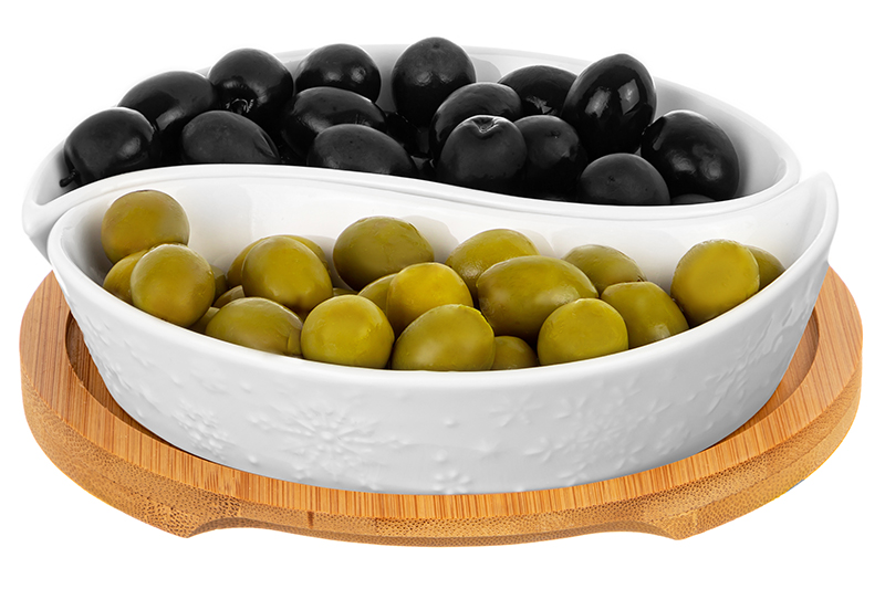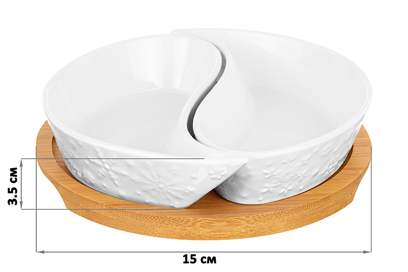 Набор 2 тарелок под оливки “Снежинки” на деревянной подставке подойдёт для подачи закусок к праздничному столу. Размер каждого изделия – 14х7х2,5 см, объём – 100 мл. Размер подставки – 15х15х1 см. Изделия выполнены из высококачественного белого фарфора и украшены рельефом в виде снежинок. Фарфор легко отмывается и не впитывает цвет продуктов. С маленькой менажницей вы сможете красиво подать маслины, орехи или сыр. Она также послужит в качестве небольшой конфетницы: угостите себя и гостей любимыми сладостями. Не рекомендуется применять абразивные моющие средства. Ёмкости без бамбуковых элементов можно использовать в посудомоечной машине и микроволновой печи. Бамбук нельзя замачивать. Набор поставляется в красивой картонной упаковке. Он станет прекрасным подарком на Новый год или Рождество и стильным дополнением вашего кухонного инвентаря. Новогодняя серия “Снежинки” отлично подойдёт для сервировки стола в зимние праздники и поможет создать атмосферу уюта.
