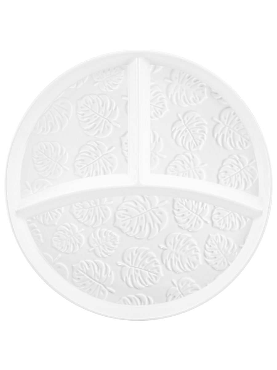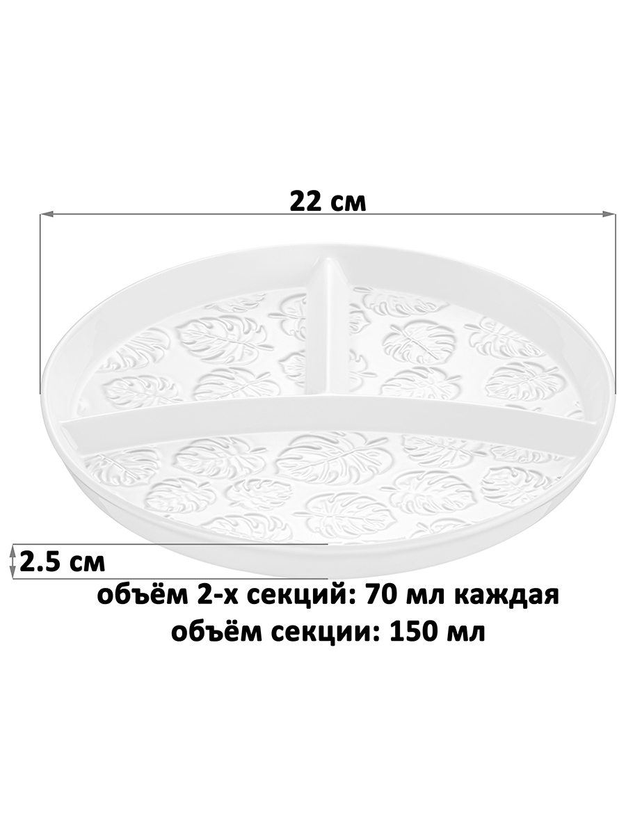 Секционная тарелка из серии «Тропики» от Elan Gallery предназначена для эстетичной сервировки вашего стола. Размер изделия – 22х22х2,5 см. Состоит из 3 секций. Объём большой – 150 мл, маленьких – 70 мл каждая. Выполнена из высококачественного белого фарфора. Он не впитывает цвет продуктов и легко отмывается, благодаря чему надолго сохранит свою белизну. Поверхность украшена рельефным узором в виде тропических листьев. Круглая тарелка с разделителями идеально подойдёт тем, кто ведёт здоровый образ жизни и придерживается диетического питания. Используйте её для соблюдения «правила тарелки»: заполните маленькие секции белками и углеводами, а большую – зеленью, овощами и фруктами. Менажница также подойдёт для стандартной сервировки и подачи разнообразных закусок: сырной и мясной нарезки, канапе и роллов. Подайте в ней конфеты и другие сладости, разложите орехи, ягоды и сухофрукты. Не рекомендуется применять абразивные моющие средства. Подходит для использования в посудомоечной машине и микроволновой печи. Поставляется в дизайнерской картонной коробке – благодаря ей вам не потребуется дополнительная подарочная упаковка. Фарфоровая сервировочная посуда будет оригинальным подарком для хозяйки, ценящей не только практичность, но и привлекательность. Серия «Тропики» от бренда Элан Галерея станет украшением любого кухонного инвентаря и позволит собрать красивый сервиз в едином стиле!