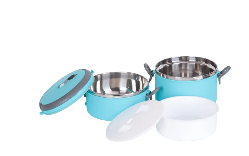 Размер 16,5*15*18 см, пластик. корпус и ручки. Крышка с силикон. уплотнителем и вакуум. клапаном, внутр. стенка из нерж. стали, 2 контейнера 850 и 1200 мл. Водонепрониц. боковые фиксаторы. Сохраняет тепло +40 в течение 4 часов. Рекомендована ручная чистка. Цвет голубой. Состав: пластик, нерж сталь.