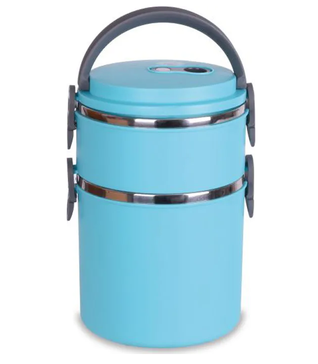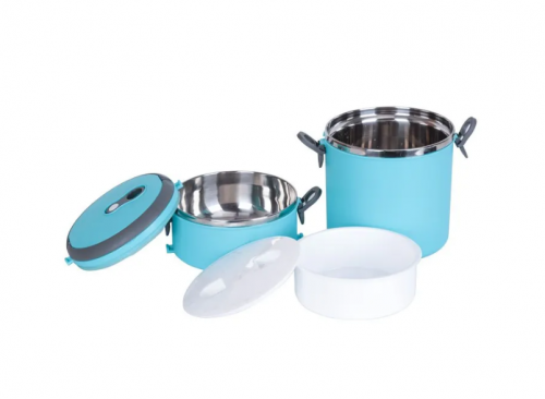 Размер 16,5*15*23 см, пластик. корпус и ручки. Крышка с силикон. уплотнителем и вакуум. клапаном, внутр. стенка из нерж. стали, 2 контейнера 850 и 1850 мл. Водонепрониц. боковые фиксаторы. Сохраняет тепло +40 в течение 4 часов. Рекомендована ручная чистка. Цвет голубой. Состав: пластик, нерж сталь.