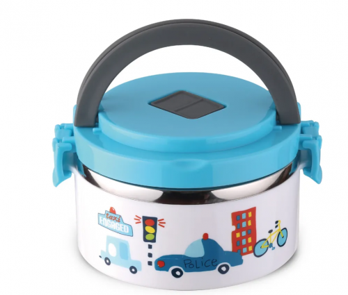 Размеры термоконтейнера 15*12,5*14,5см. Термоконтейнер состоит их двух емкостей по 600 мл. каждая. Корпус пластиковый, внутренняя стенка из нержавеющей стали, ручки пластиковые, вакуумный клапан, водонепроницаемые боковые фиксаторы, крышка с силиконовым уплотнителем. Крышка голубая, корпус - детский рисунок (машинки). Состав: пластик и нерж. сталь.Рекомендована ручная чистка.