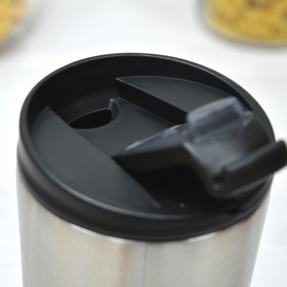 450мл, размер 6,8*7,8*22,4см, двойные стенки, черный корпус, пластиковая крышка. Не подходит для посудомоечных машин. Состав: нержав. сталь и пластик.