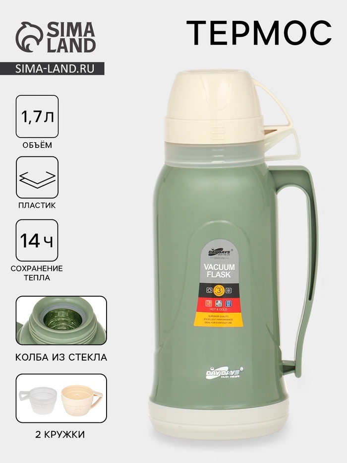 Термос 1.7 л, 14×34 см, со стеклянной колбой, сохраняет тепло 14 ч, зеленый