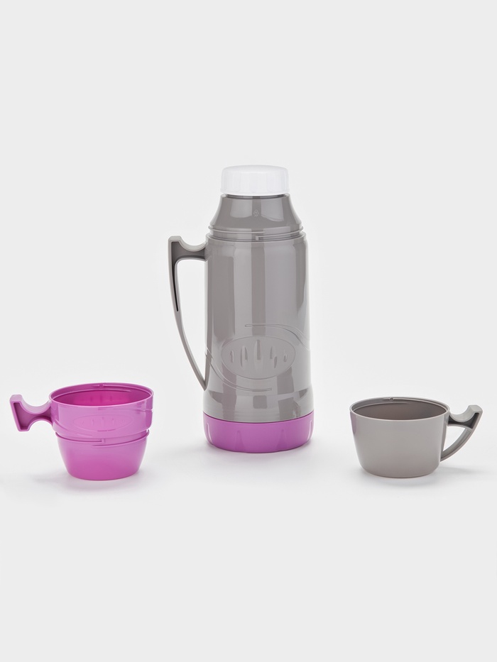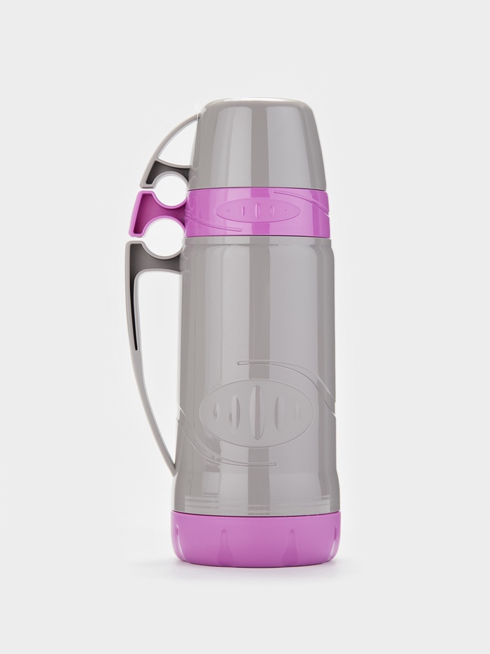 Напитки остаются свежими до 8 часов. Термос объёмом 1 л в фиолетовом и сером цвете с пластиковым корпусом, со стеклянной колбой и стандартным горлом, предназначен для напитков.