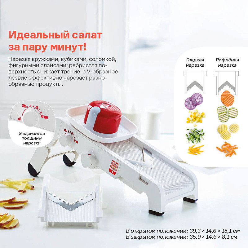 Терка –шинковка «Мандолина» от компании Tupperware – это высококачественный кухонный инструмент, который позволяет экономить время, быстро и эффективно нарезать фрукты и овощи на ровные ломтики, рифлёные брусочки, рифлёные чипсы, брусочки фри, соломку, кубики, ромбики, кольца и др.