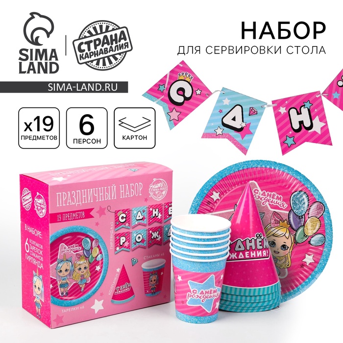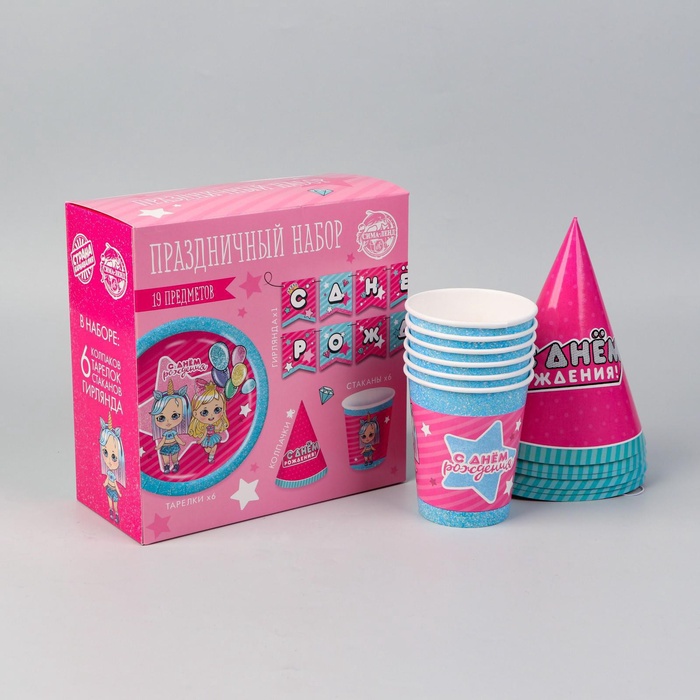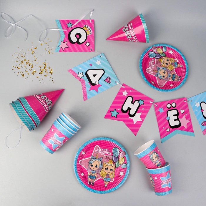 УЦЕНКА Набор бумажной посуды «Подружки», 6 тарелок, 6 стаканов, 6 колпаков, 1 гирлянда