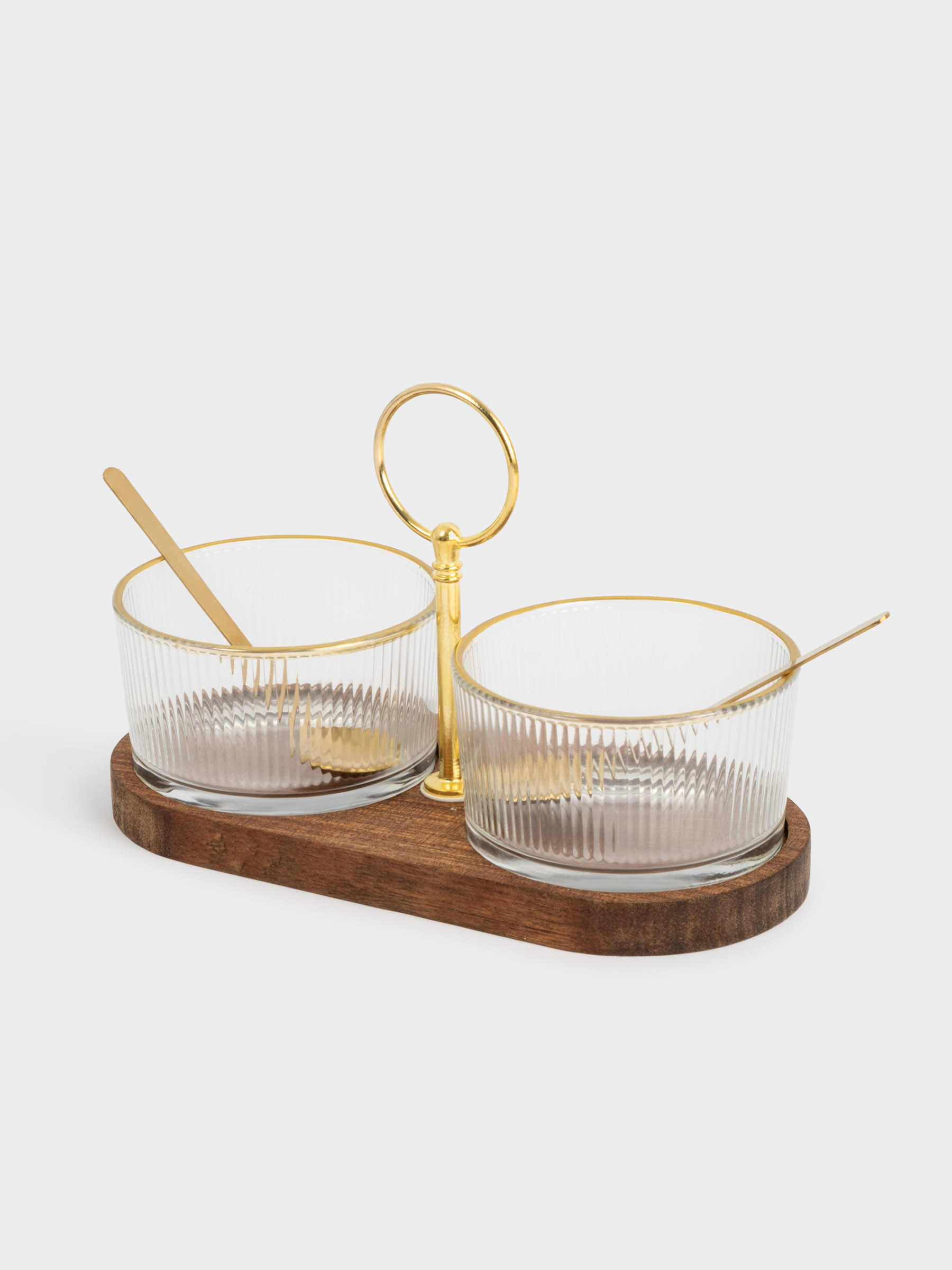Вазочка для джема, 20x10 см, 2 шт, с ложками, на подставке, стекло/дерево/нержавеющая сталь, золотистая, Sonnet