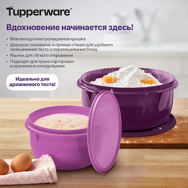 Специальное блюдо с влаговоздухонепроницаемой крышкой удобно как для замешивания теста, так и для безопасной транспортировки продуктов без риска проливания.