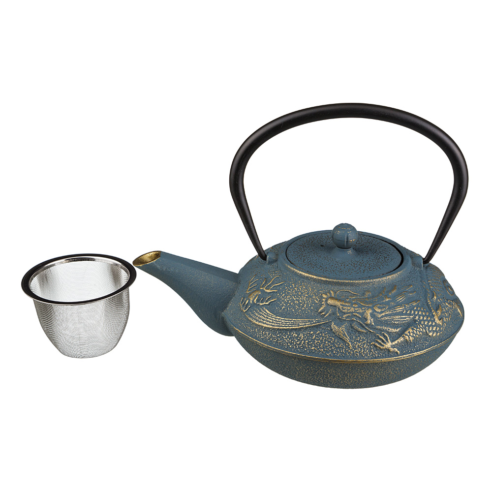 Устройте себе настоящую чайную церемонию с традиционным чугунным заварочным чайником. Внутренняя поверхность чайника покрыта эмалью, которая надежно защищает чайник от ржавчины и препятствует возникновению металлического привкуса у напитка, в связи с чем чайник идеально подойдет для заваривания Вашего любимого пуэра, улуна, черного, травяного или ароматизированного чая, раскрывая всю полноту вкуса напитка. В комплекте идет ситечко, которое надежно удерживает заварку. Не смотря на свои маленькие компактные размеры, этот чайник вмещает в себя 700 мл, а его презентабельный внешний вид будет выигрышно смотреться на любом празднике.