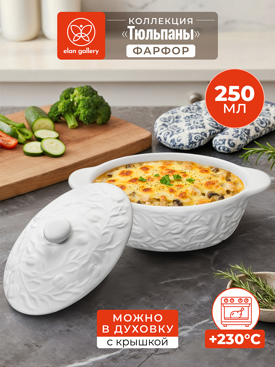 Жюльенница-кокотница от бренда Elan Gallery "Тюльпаны" с крышкой выполнена из белого фарфора. Размер жюльенницы – 16х10х8 см, объём – 250 мл, высота без крышки – 5 см, внутренний размер – 12,5х8,5х4,5 см. Посуда украшена изящным рельефным узором с цветами. Форму с крышечкой можно использовать для приготовления жюльена, а также для выпекания разнообразных десертов, кондитерских и кулинарных изделий. Красивую жюльенницу после приготовления можно сразу подавать на стол. Фарфоровая посуда отличается от керамической повышенной плотностью. Фарфор не впитывает цвет продуктов и не деформируется от влаги, чему может быть подвержена керамика. Не рекомендуется применять абразивные моющие средства. Можно использовать в микроволновой печи, посудомоечной машине и для запекания в духовом шкафу при температуре до 230 градусов. Станет приятным подарком на любой праздник. Поставляется в стильной коробке, благодаря которой не потребуется дополнительная подарочная упаковка. В коллекции бренда Элан Галерея можно найти много красивой посуды, кухонного инвентаря и товаров для дома. Серия "Тюльпаны" позволит собрать сервиз в едином стиле и станет украшением вашей кухни!