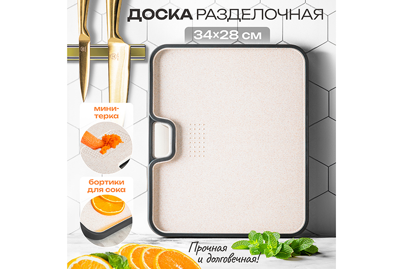 Разделочная доска предназначена для нарезки продуктов. Размер изделия – 34х28х1,7 см. Выполнена из полипропилена. Этот материал отличается своей прочностью и долговечностью, устойчив к механическим повреждениям и хорошо выдерживает интенсивное использование. В отличие от деревянных досок, полипропилен не впитывает влагу, что продлевает срок службы и облегчает уход за изделием. Доска оснащена ассиметричными бортиками: они предотвратят попадание сока от овощей и фруктов на стол и не позволят нарезанным кусочкам соскользнуть. Благодаря своему лаконичному и эстетичному дизайну доска не только впишется в любой интерьер, но и подойдёт для красивой сервировки жареного мяса, сырной и колбасной нарезки, домашних роллов и других блюд – вам не придётся задействовать дополнительную посуду. Доска многофункциональна: на её поверхности есть маленькая тёрка для чеснока. Удобно хранить – отверстие для подвешивания позволит разместить её на настенном крючке или рейле. Не рекомендуется применять абразивные моющие средства. Подходит для использования в посудомоечной машине. Досточка станет оригинальным и полезным подарком для хозяйки, ценящей не только удобство, но и стиль. Универсальное дополнение вашего кухонного инвентаря обязательно станет вашим верным помощником и незаменимым аксессуаром! /
