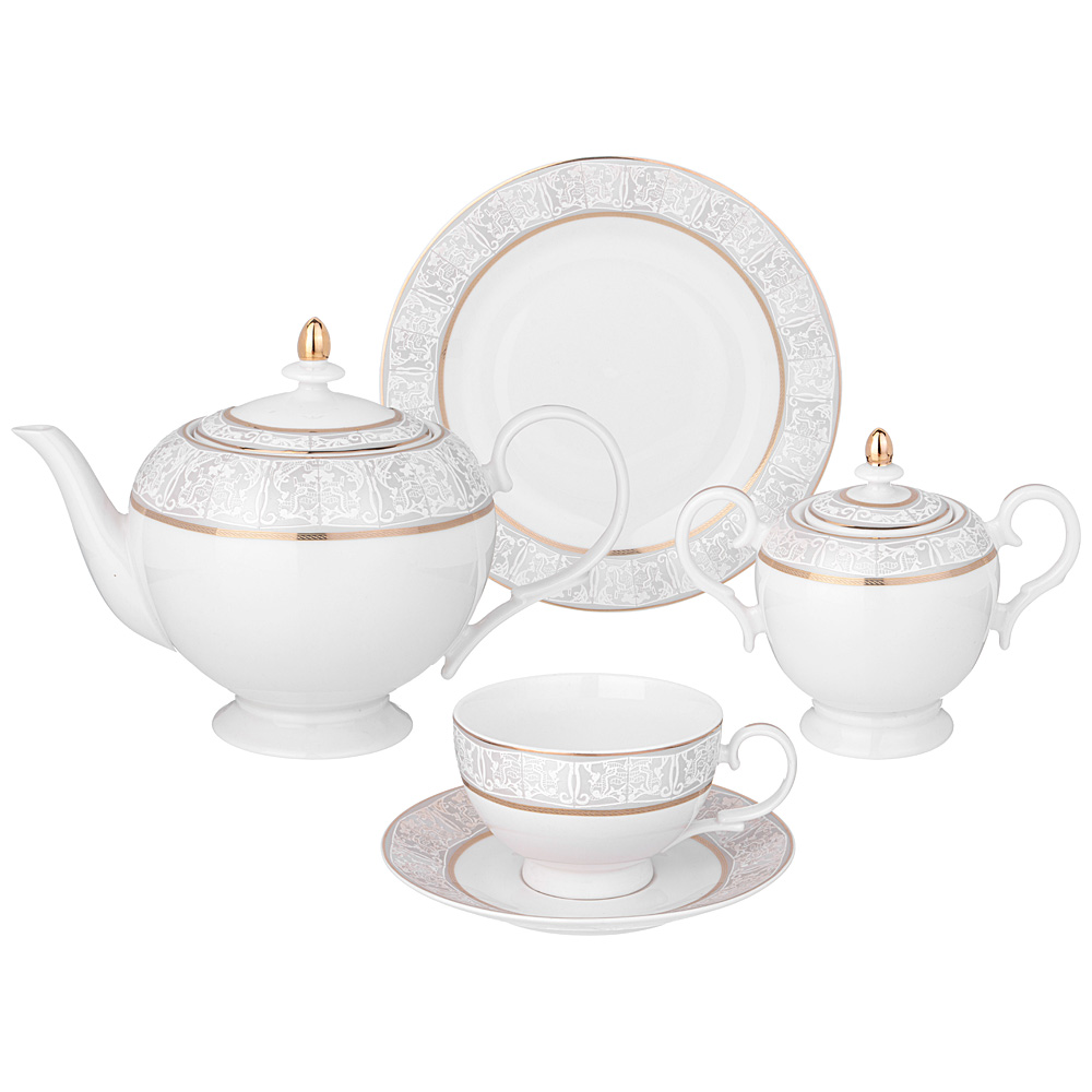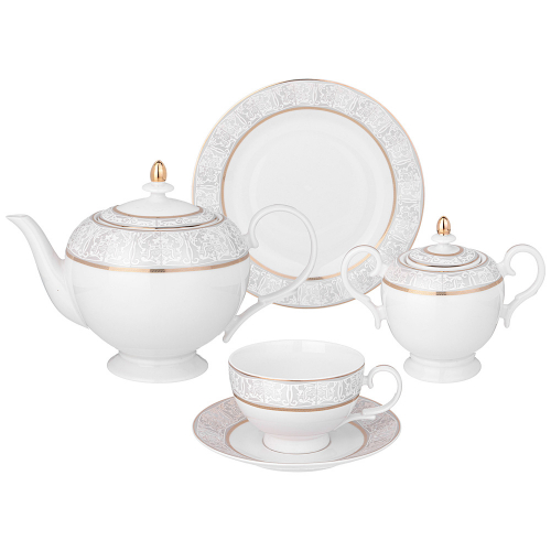 ТМ LEFARD Сервиз чайный "Свадебный" для торжественного чаепития и семейных застолий. Изысканный фарфор Bone Pocelain с эффектом костяного фафора, тонкий и полупрозрачный, прочный и никогда не темнеет. Утонченный кружевной рельефный орнамент выглядит объемным и привлекательным благодаря различной обработке выпуклых и базовых поверхностей. Изящная золотая обводка придает блеск и торжественность. Эта посуда замечательный подарок на свадьбу, юбилей, день рождения, который наверняка пригодится каждой семье, запомнится навсегда и прослужит долгие годы. Дизайнеры торговой марки предлагают обеденный сервиз и наборы тарелок и чайных пар, чтобы сформировать полную сервировку стола предметами коллекции на 6 или 12 персон.