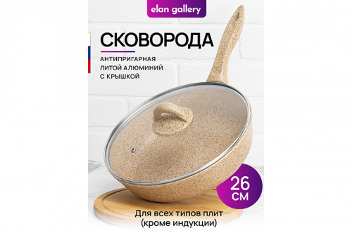 Глубокая сковорода Elan Gallery "Медовый гранит" из серии "Гармония вкуса" диаметром 18 см с крышкой равномерно разогревается и распределяет тепло таким образом, что продукты в ней сохраняют свои полезные свойства, сочность и вкус. Диаметр дна сковороды — 14,5 см. Стильный дизайн, имитирующий гранит, подойдет к любому интерьеру вашей кухни. Сковорода с глубоким дном выполнена из толстостенного литого алюминия и имеет ультрапрочное двухслойное антипригарное покрытие Cookmark. Оно устойчиво к царапинам и износу, полностью безопасно для здоровья и не содержит PFOA или других вредных веществ. Сковороду можно использовать для жарки с минимальным количеством масла для приготовления здоровой пищи, что оценит любой гурман. Готовьте дома любимые стейки, они сохранят свою сочность, нежность и аромат! Сковорода подходит для приготовления блюд из рыбы, мяса, овощей, а также плова. Сковородка станет идеальным помощником для создания завтрака, например: яичницы, омлета, блинов, оладий. Имеет удобную ручку, что обеспечивает надежный захват при подаче еды с плиты на стол. Стеклянная крышка позволит сохранить тепло блюда, защитит от брызг, а также поможет следить за процессом приготовления пищи. Эксплуатация: не нагревать без продуктов. Дайте посуде остыть, прежде чем помещать ее в воду. Использовать только деревянные, силиконовые и пластиковые лопатки без острых краёв. Не мыть абразивными или щелочными моющими средствами. Использовать в посудомоечной машине только в режиме "Эко" с использованием средств, не содержащих щелочи. Подходит для всех типов плит, кроме индукционных. Сковорода станет идеальным подарком для женщин и придаст процессу приготовления пищи новый уровень комфорта. Подарите такую универсальную вещь маме, подруге, сестре или тёте. Хорошая сковорода – мечта любой хозяйки! /