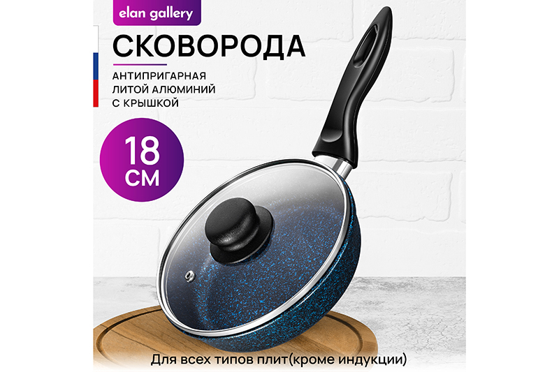 Глубокая сковорода Elan Gallery "Сапфир" из серии "Гармония вкуса" диаметром 18 см с крышкой равномерно разогревается и распределяет тепло таким образом, что продукты в ней сохраняют свои полезные свойства, сочность и вкус. Диаметр дна сковороды — 14,5 см. Благодаря стильному дизайну станет украшением вашей кухни. Сковорода с глубоким дном выполнена из толстостенного литого алюминия и имеет ультрапрочное двухслойное антипригарное покрытие Cookmark. Оно устойчиво к царапинам и износу, полностью безопасно для здоровья и не содержит PFOA или других вредных веществ. Сковороду можно использовать для жарки с минимальным количеством масла для приготовления здоровой пищи, что оценит любой гурман. Готовьте дома любимые стейки, они сохранят свою сочность, нежность и аромат! Сковорода подходит для приготовления блюд из рыбы, мяса, овощей, а также плова. Сковородка станет идеальным помощником для создания завтрака, например: яичницы, омлета, блинов, оладий. Имеет удобную ручку, что обеспечивает надежный захват при подаче еды с плиты на стол. Стеклянная крышка позволит сохранить тепло блюда, защитит от брызг, а также поможет следить за процессом приготовления пищи. Эксплуатация: не нагревать без продуктов. Дайте посуде остыть, прежде чем помещать ее в воду. Использовать только деревянные, силиконовые и пластиковые лопатки без острых краёв. Не мыть абразивными или щелочными моющими средствами. Использовать в посудомоечной машине только в режиме "Эко" с использованием средств, не содержащих щелочи. Подходит для всех типов плит, кроме индукционных. Кухонная утварь станет чудесным подарком на любой праздник и придаст процессу приготовления пищи новый уровень комфорта! /