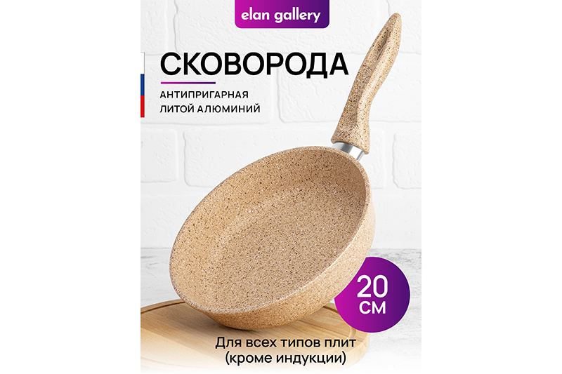 Глубокая сковорода Elan Gallery "Медовый гранит" из серии "Гармония вкуса" диаметром 20 см равномерно разогревается и распределяет тепло таким образом, что продукты в ней сохраняют свои полезные свойства, сочность и вкус. Диаметр дна сковороды — 16,5 см. Стильный дизайн, имитирующий гранит, подойдет к любому интерьеру вашей кухни. Сковорода с глубоким дном выполнена из толстостенного литого алюминия и имеет ультрапрочное двухслойное антипригарное покрытие Cookmark. Оно устойчиво к царапинам и износу, полностью безопасно для здоровья и не содержит PFOA или других вредных веществ. Сковороду можно использовать для жарки с минимальным количеством масла для приготовления здоровой пищи, что оценит любой гурман. Готовьте дома любимые стейки, они сохранят свою сочность, нежность и аромат! Сковорода подходит для приготовления блюд из рыбы, мяса и овощей. Сковородка станет идеальным помощником для создания завтрака, например: яичницы, омлета, блинов, оладий. Имеет удобную ручку, что обеспечивает надежный захват при подаче еды с плиты на стол. Эксплуатация: не нагревать без продуктов. Дайте посуде остыть, прежде чем помещать ее в воду. Использовать только деревянные, силиконовые и пластиковые лопатки без острых краёв. Не мыть абразивными или щелочными моющими средствами. Использовать в посудомоечной машине только в режиме "Эко" с использованием средств, не содержащих щелочи. Подходит для всех типов плит, кроме индукционных. Сковорода станет идеальным подарком для женщин и придаст процессу приготовления пищи новый уровень комфорта. Подарите такую универсальную вещь маме, подруге, сестре или тёте. Хорошая сковорода – мечта любой хозяйки! Со сковородкой "Гармония вкуса" вы можете готовить с радостью и любовью, создавая вкусные блюда для себя и своих гостей. Она станет незаменимым инвентарем на вашей кухне, сделает процесс приготовления пищи легким и наполнит его удовольствием! /
