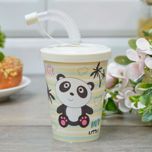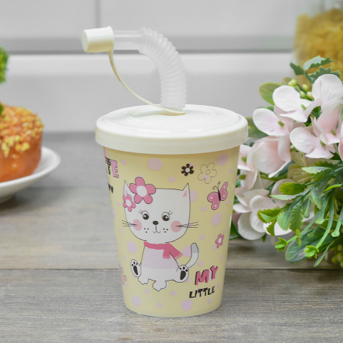 Стакан 280мл с крышкой, трубочкой и колпачком " Кошечка" (светло-бежевый)