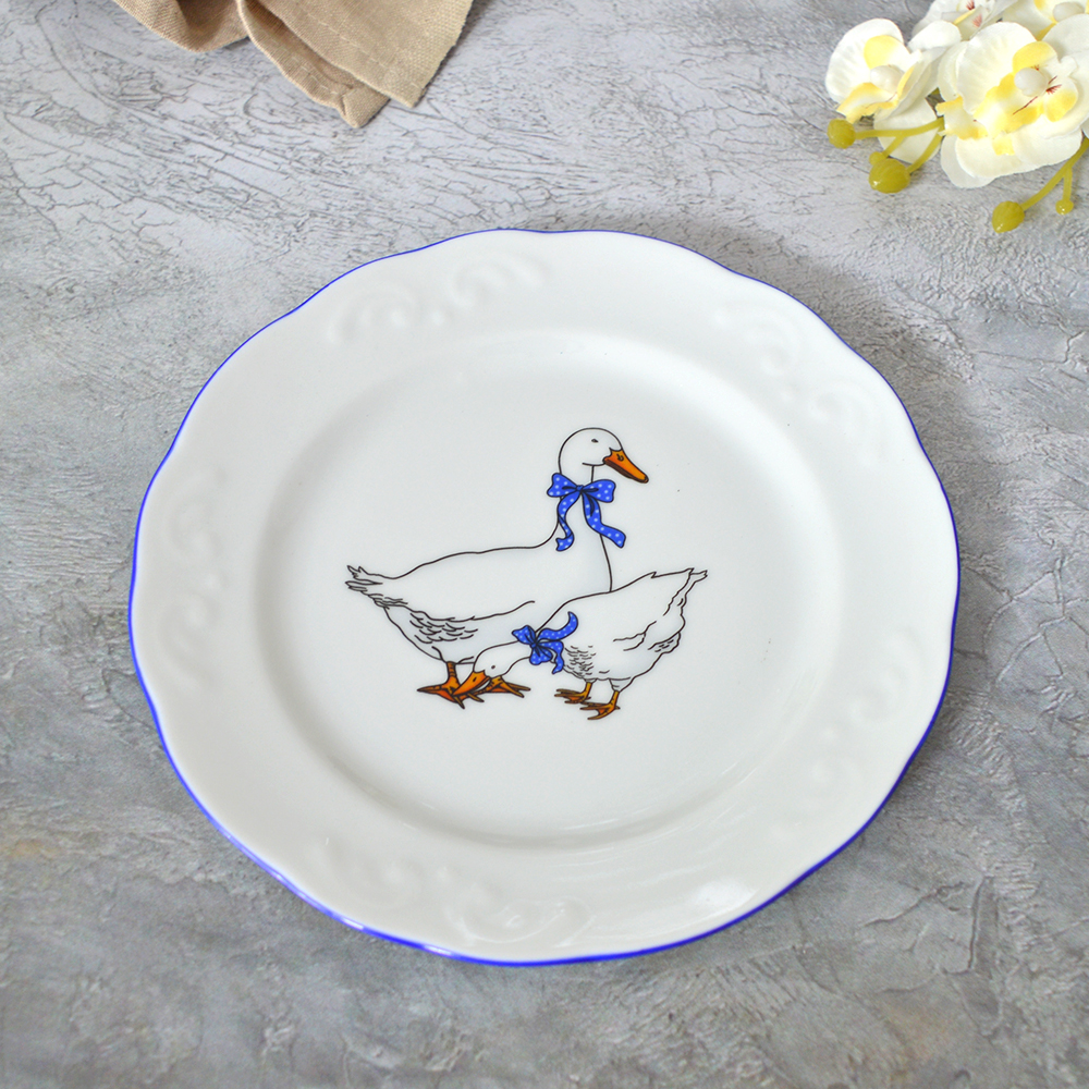 Тарелка 175мм мелкая форма Надежда ГусиТарелка с изображением гусей понравится детям.Тарелка выполнена из качественного фарфора.Диаметр - 17,5 см.Заключаем договора по 44 ФЗ, 223 ФЗ
