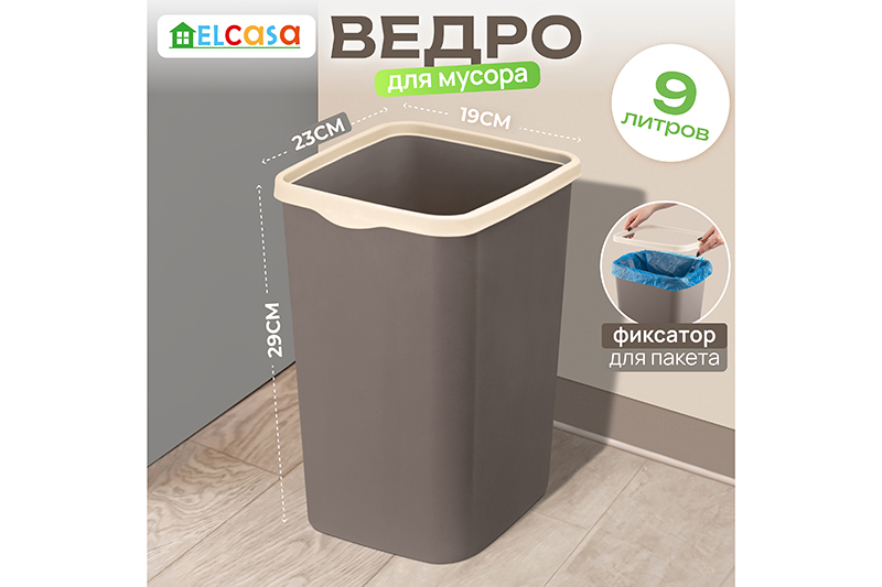 Ведро для мусора с фиксатором ELCASA "Тандем" размером 23,5х19,2х29 см и объёмом 9 литров поможет поддерживать чистоту в вашем доме, офисе или на улице. Мусорное ведро выполнено из полипропилена в шоколадном цвете с фиксатором в оттенке слоновая кость. Этот вид пластика считается наиболее безопасным, так как не содержит бисфенол А и не выделяет вредных веществ. Мусорное ведро прямоугольной формы можно разместить в ванной комнате, туалете или на кухне. Удобный держатель в виде ободка помогает зафиксировать мусорный пакет на ведре и не даёт ему сползать. Поставьте урну из пластика на пол возле раковины, стола или в хозяйственный шкаф. Высокое пластиковое ведёрко можно использовать как офисное – под ненужные бумаги. Большая ёмкость обеспечивает достаточное пространство для хранения мусора любого вида. Можно приспособить на даче как уличную мусорку. Пластиковые мусорные вёдра выполнены в универсальном дизайне и хорошо сочетаются друг с другом. Можно использовать несколько баков из пластика серии "Тандем" для организации раздельной системы сбора мусора. Корзина с фиксатором станет незаменимым помощником для поддержания чистоты как в доме, так и на улице и поможет организовать порядок в любом пространстве. /