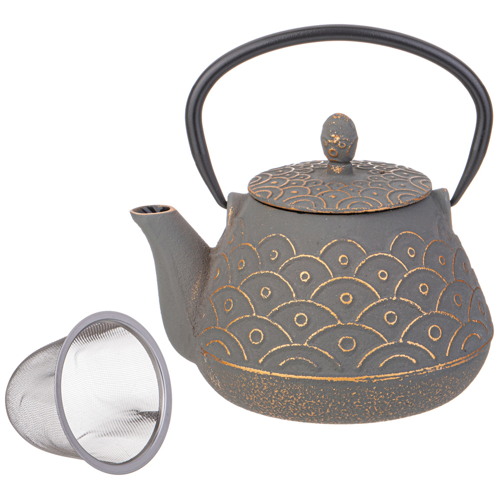 Устройте себе настоящую чайную церемонию с традиционным чугунным заварочным чайником. Внутренняя поверхность чайника покрыта эмалью, которая надежно защищает чайник от ржавчины и препятствует возникновению металлического привкуса у напитка, в связи с чем чайник идеально подойдет для заваривания Вашего любимого пуэра, улуна, черного, травяного или ароматизированного чая, раскрывая всю полноту вкуса напитка. В комплекте идет ситечко, которое надежно удерживает заварку. Не смотря на свои маленькие компактные размеры, этот чайник вмещает в себя 1000 мл, а его презентабельный внешний вид будет выигрышно смотреться на любом празднике.