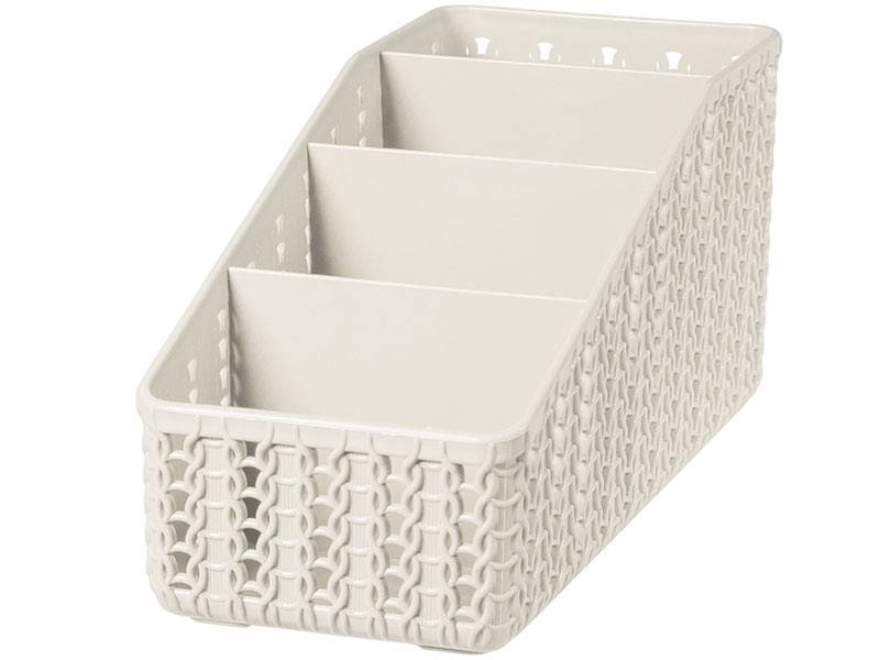Органайзер Вязание 4 секции (Белый ротанг)• органайзер имеет 4 отделения разной высоты• подойдет для хранения специй, столовых приборов, канцелярии, косметики• текстура поверхности напоминает вязаное изделиеЗаключаем договора по 44 ФЗ, 223 ФЗ
