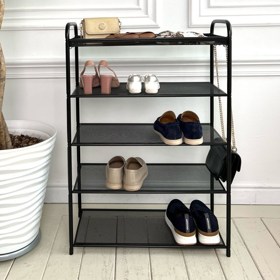 Подставка для обуви "Верона 25" черная создана для компактного хранения обуви в доме или офисе. Долговечная, благодаря каркасу и полкам из стали. 4 полки вместят до 8 пар обуви, а продуманные расстояния между ними позволят разместить как летнюю, так и зимнюю обувь. Каждая полка выдерживает нагрузку до 8 кг.Верхняя корзина позволяет разместить разные мелочи, а боковые крючки – ложку для обуви и ключи.Подставку можно использовать не только для хранения обуви, но и как стеллаж для прочих предметов.Размер - 65х30х95 см.Заключаем договора по 44 ФЗ, 223 ФЗ