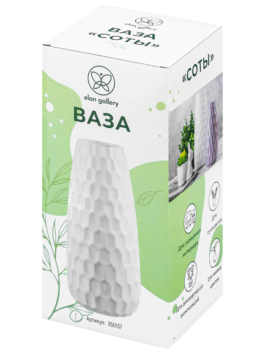 Настольная ваза Elan Gallery "Соты" размером 12,5х12,5х28 см и объёмом 2,5 литра выполнена из керамики. Вазочка с матовой поверхностью чёрного цвета украшена рельефным узором. Интерьерная ваза подойдёт для размещения букетов, искусственных цветов или сухоцветов. Стильная вазочка послужит элементом декора для вашего дома. В ней красиво будут смотреться букеты из любых цветов или веточек: роз, тюльпанов или вербы. Интерьерная ваза украсит комнату даже при использовании без наполнения. Эргономичная форма позволит поставить в неё цветы с длинными стеблями. Разместите декоративную вазу на столе или полке, чтобы создать в комнате стильный акцент. Не рекомендуется применять абразивные моющие средства. Большая настольная ваза поставляется в стильной картонной упаковке. Станет приятным подарком вашим близким: маме, бабушке, сестре или подруге на любой праздник. Красивая керамическая ваза украсит интерьер вашего дома и подчеркнёт красоту любого цветка!