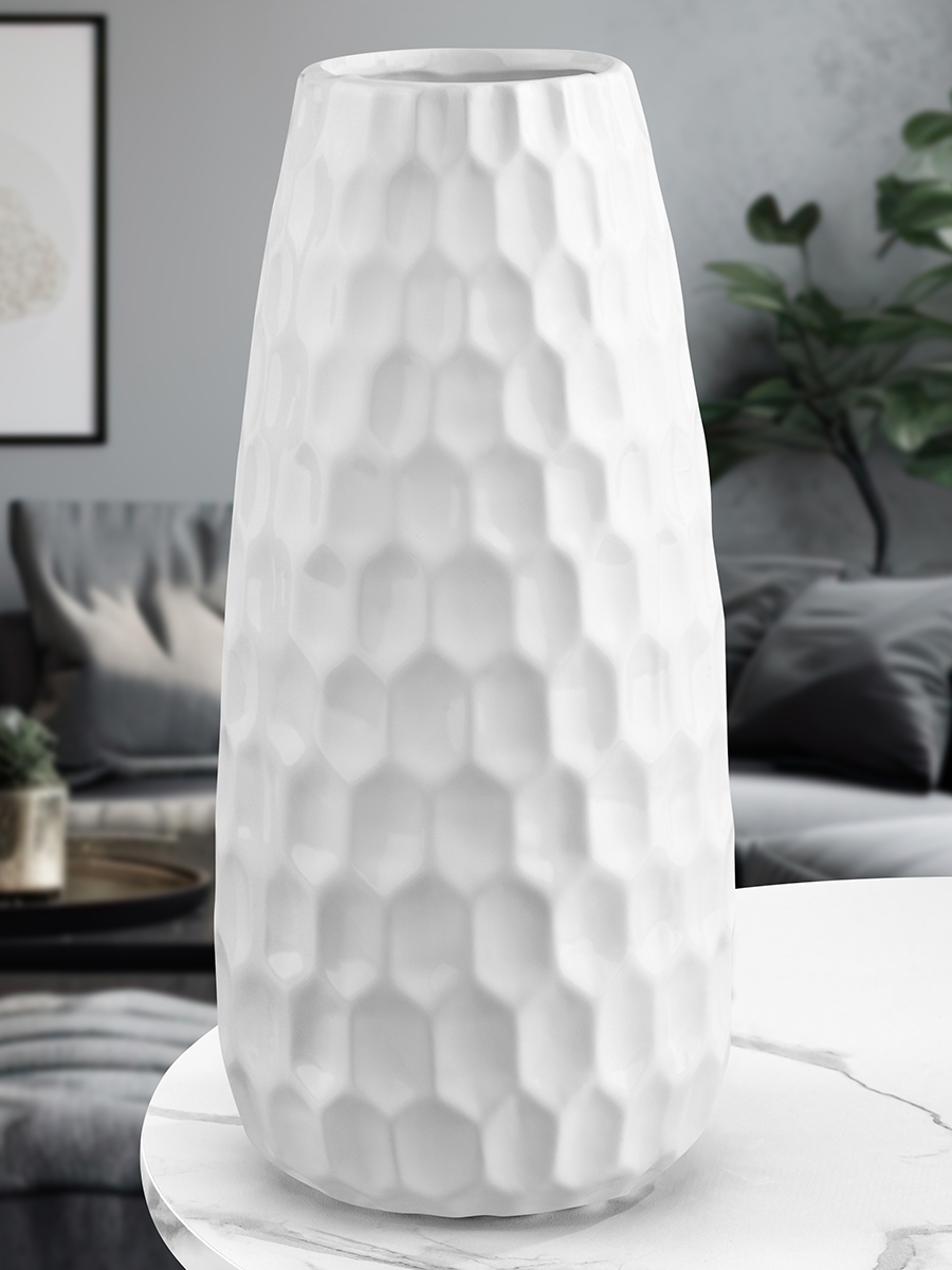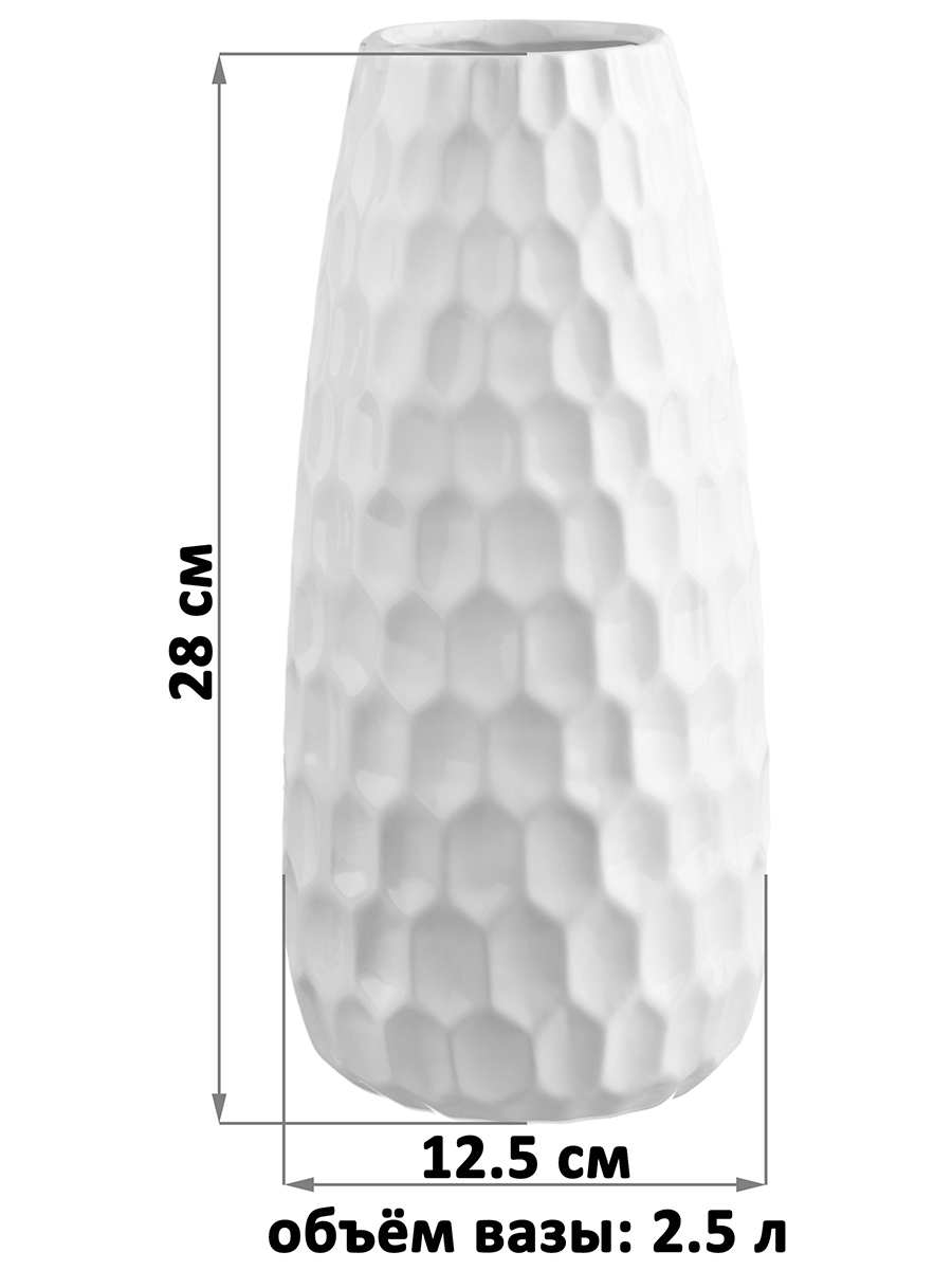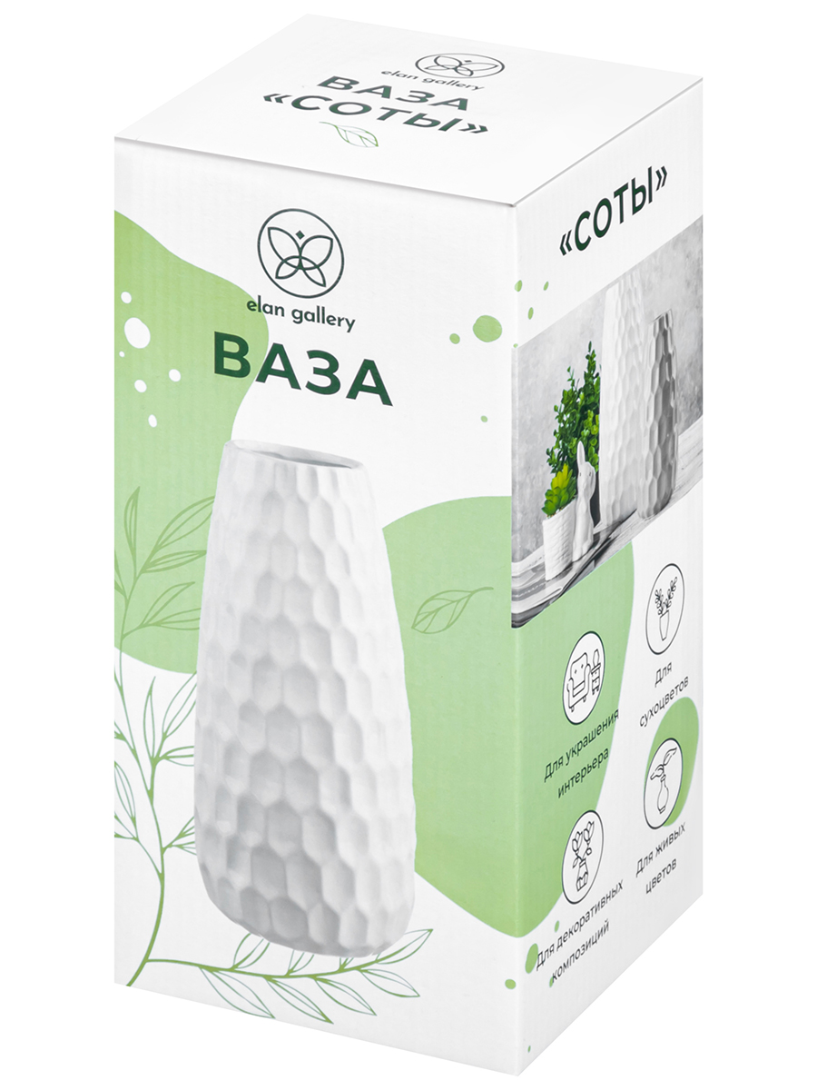 Настольная ваза Elan Gallery "Соты" размером 12,5х12,5х28 см и объёмом 2,5 литра выполнена из керамики. Диаметр горлышка – 6,5 см. Высокая вазочка в оттенке "пломбир" украшена рельефным узором, напоминающим пчелиные соты. Интерьерная ваза в стиле минимализм подойдёт для размещения букетов, искусственных цветов или сухоцветов. Она послужит элементом декора вашего дома и поможет украсить его любыми растениями. Как красиво будут смотреться букеты из цветов и веточек на кухне, а также в любой другой комнате! Поставьте на видное место розы, тюльпаны или вербу для оформления интерьера в квартире. Интерьерная ваза украсит комнату даже без наполнения и подойдёт для создания декоративных композиций на журнальном столике или полке. Эргономичная форма позволит поставить в неё цветы с длинными стеблями. Не рекомендуется применять абразивные моющие средства. Поставляется в красочной картонной коробке с логотипом бренда. Станет чудесным подарком на любой праздник. Благодаря стильной коробочке вам не понадобится дополнительная подарочная упаковка. Сделайте сюрприз ценителям эстетики! Красивое керамическое изделие станет украшением вашего дома и подчеркнёт красоту любого цветка. Ознакомьтесь с другими товарами для дома от бренда Элан Галерея, здесь вы найдёте всё для создания домашнего уюта!