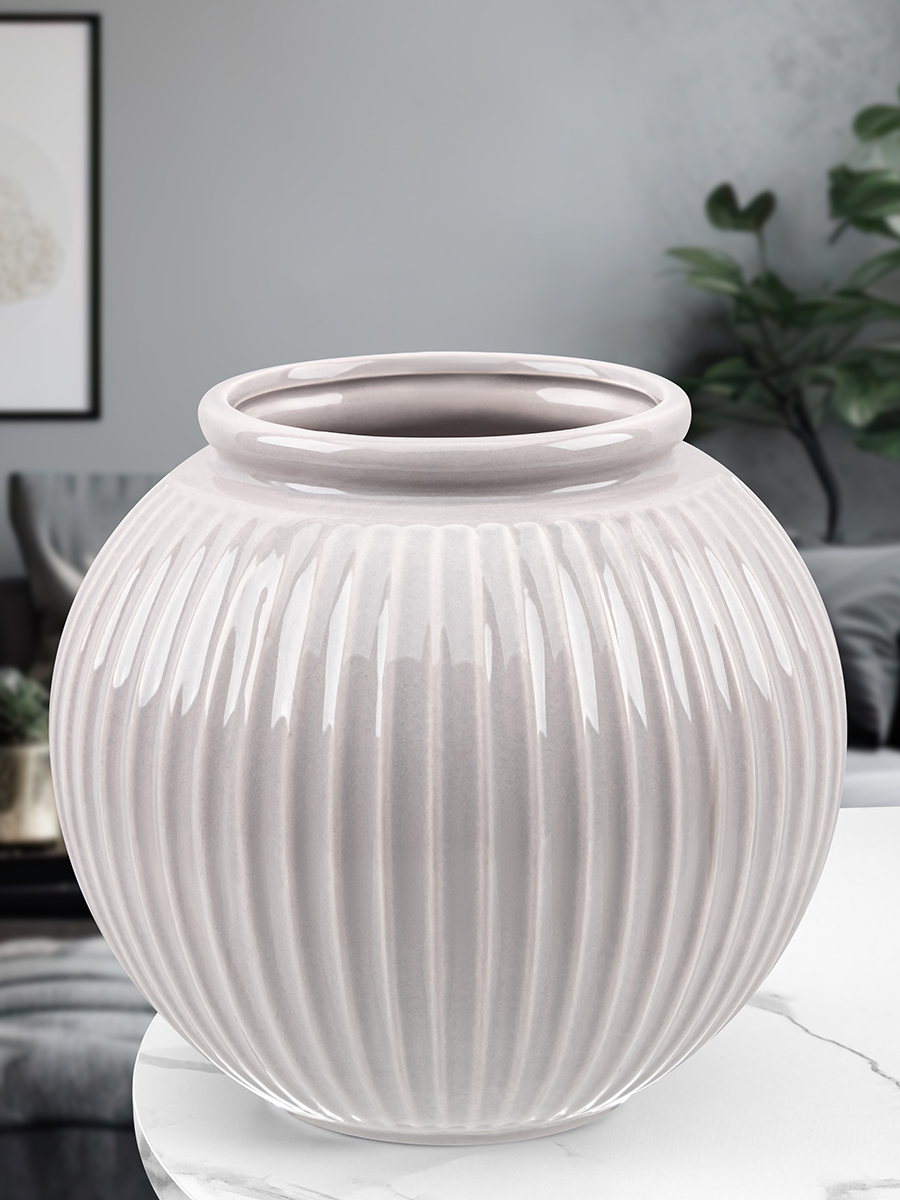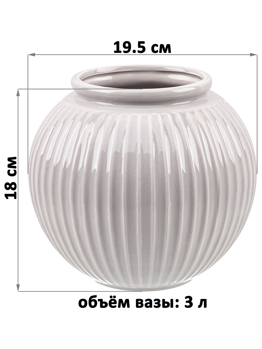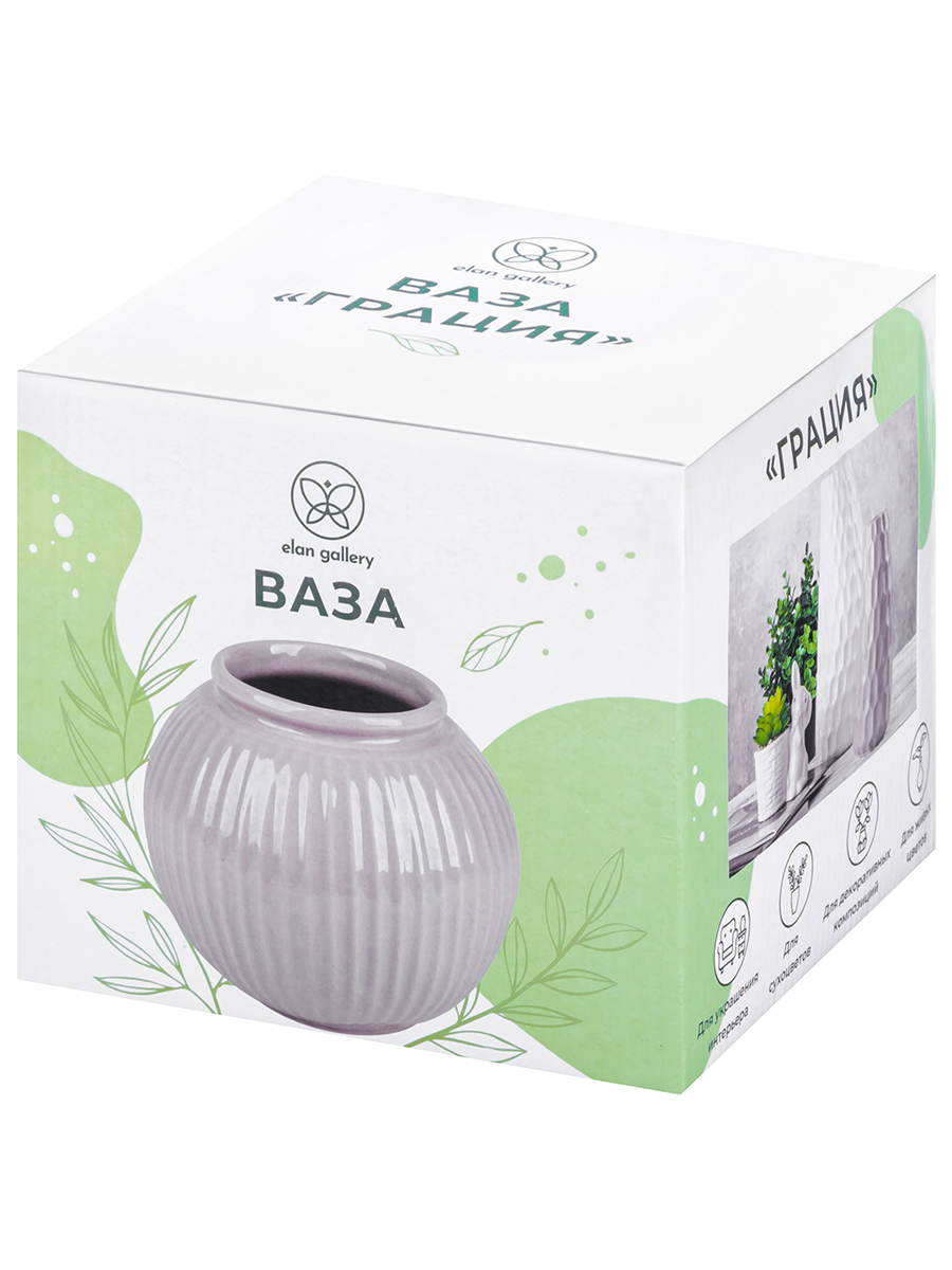 Настольная ваза Elan Gallery "Грация" размером 19,5х19,5х18 см и объёмом 3 литра выполнена из керамики. Вазочка в оттенке латте украшена вертикальными рельефными полосами. Имеет широкое горлышко внутренним диаметром 10 см. Интерьерная ваза подойдёт для размещения букетов, искусственных цветов или сухоцветов. Стильная вазочка послужит элементом декора для вашего дома. В ней красиво будут смотреться букеты из любых цветов или веточек: роз, тюльпанов или вербы. Интерьерная ваза украсит комнату даже при использовании без наполнения. Эргономичная форма позволит поставить в неё букет из большого количества цветов. Разместите декоративную вазу на столе или полке, чтобы создать в комнате стильный акцент. Не рекомендуется применять абразивные моющие средства. Круглая настольная ваза поставляется в стильной картонной упаковке. Станет приятным подарком вашим близким: маме, бабушке, сестре или подруге на любой праздник. Красивая керамическая ваза украсит интерьер вашего дома и подчеркнёт красоту любого цветка!
