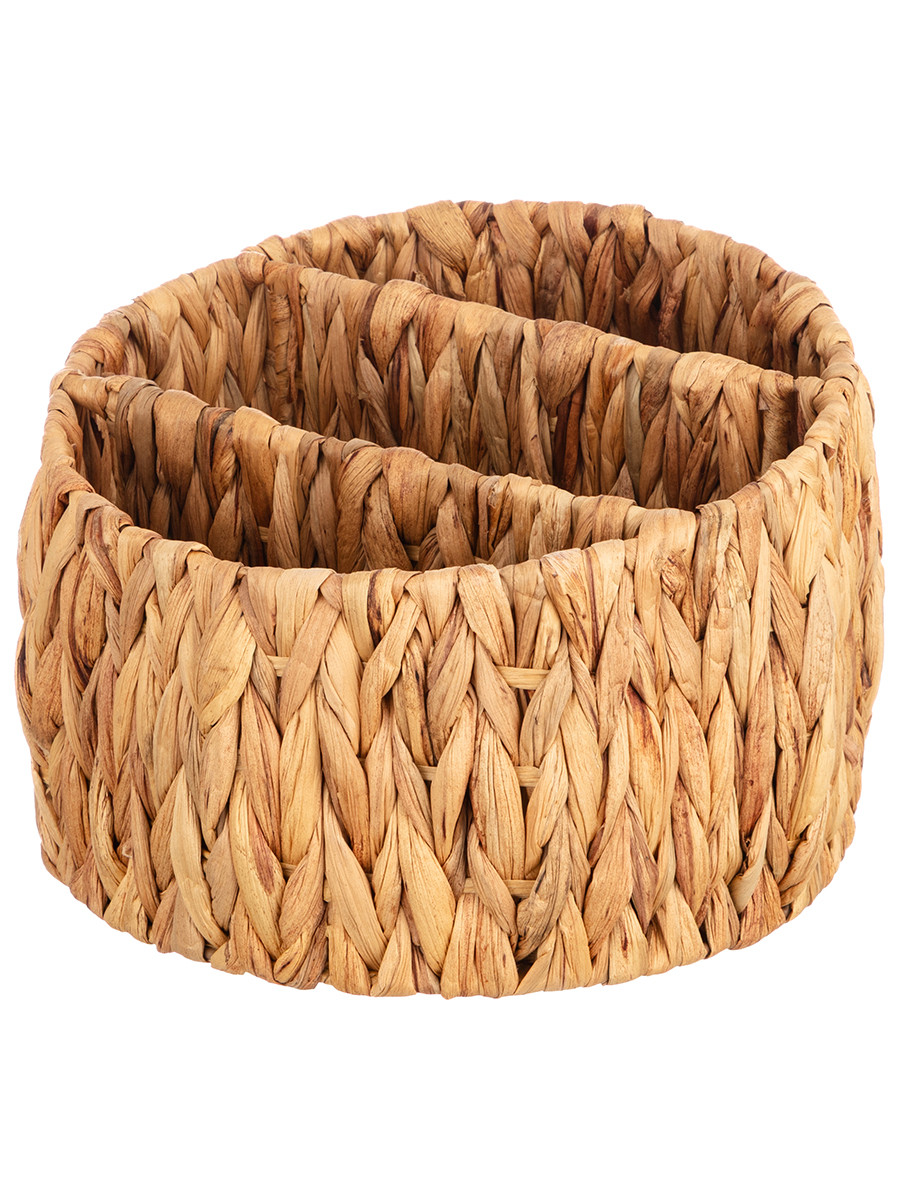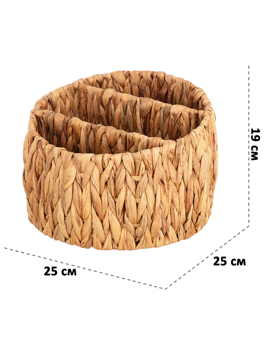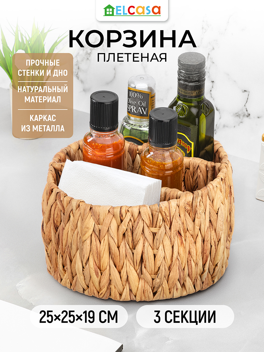 Корзина от ELCASA предназначена для организации системы хранения вещей в вашем доме. Размер изделия – 25х25х19 см. Имеет три секции разных размеров: 21,5х7,5х17 см, 25х9,5х16 см и 21,5х7,5х14 см. Поскольку каждый экземпляр – это ручная работа из природного материала, размер секций может отличаться от заявленного на несколько миллиметров. Прочные стенки представляют собой плетение из водного гиацинта – материала, устойчивого к влаге и перепадам температур. Такое преимущество позволяет использовать органайзер на балконе или в ванной. Благодаря элегантному дизайну и мягкой круглой форме он станет не только практичным, но и привлекательным элементом декора и стильным дополнением вашего интерьера. Эстетичная плетёная корзиночка послужит контейнером для хранения мелочей и аксессуаров. Поставьте её на рабочий стол дома или в офисе в качестве настольного органайзера, компактно разместив канцелярию и документы. Подойдёт для хранения принадлежностей для художника, ниток для вышивания, швейного инвентаря и других предметов творчества. На туалетном столике используйте её под косметику, лаки для ногтей, инструменты для макияжа и маникюра. На прикроватном столике храните в ней ушные палочки, ватные диски и крема для рук. Сложите в неё провода, подвески, аксессуары и принадлежности для рукоделия. Три секции с прочными разделителями позволят вам сортировать предметы, организовав практичную систему. Корзиночка с экзотичным и натуральным дизайном преобразит интерьер кухни или гардеробной. Она послужит уникальным декоративным дополнением вашей квартиры или дома. В коллекции бренда ЭЛЬКАСА представлены разнообразные товары для дома, которые привнесут в ваш быт практичности и стиля.