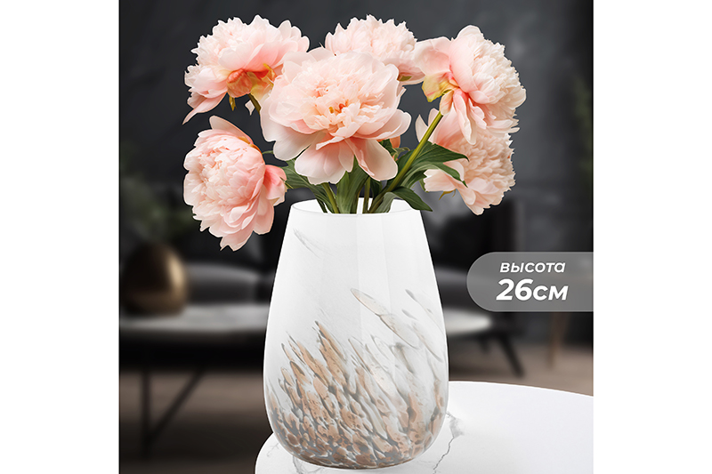 Ваза ручной выдувки от Elan Gallery объёмом 5 литров выполнена из стекла. Размер 19х19х26 см, внутренний диаметр горлышка 12 см. Широкая ваза молочно-белого цвета украшена абстрактным рисунком в виде пятнышек с мелкими блёстками. Имеет гладкую поверхность. Благодаря блестящим элементам изображение сияет и переливается на свету. Подойдёт для живых и искусственных цветов, веток и сухоцветов. Стильная вазочка послужит элементом декора для вашего дома. В ней красиво будут смотреться букеты из любых цветов или веточек: роз, тюльпанов, вербы. Большая интерьерная ваза имеет стильный дизайн, поэтому украсит комнату даже без наполнения. Подойдёт для оформления декоративных композиций. Эргономичная форма позволит поставить в неё цветы с длинными стеблями. Разместите декоративную вазу на столе или полке, чтобы украсить спальню роскошным букетом пионов или другими растениями! На Новый год и Рождество поставьте в стеклянную вазочку еловые ветки с ёлочными игрушками для создания праздничной атмосферы. Не рекомендуется применять абразивные моющие средства. Поставляется в картонной коробке. Сделайте сюрприз своим близким или коллегам на любой праздник! Предметы декора – хороший подарок как мужчине, так и женщине. Красивый дизайн и функциональность понравятся каждому! Вазочка станет украшением домашнего интерьера и подчеркнёт красоту любого цветка. В коллекции бренда Elan Gallery можно найти много стильных товаров для дома. Здесь есть всё для создания уюта в квартире и на даче!