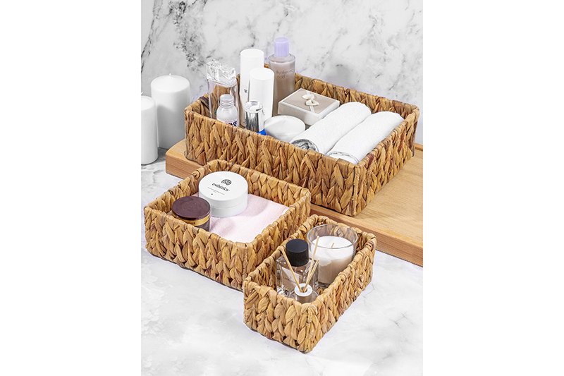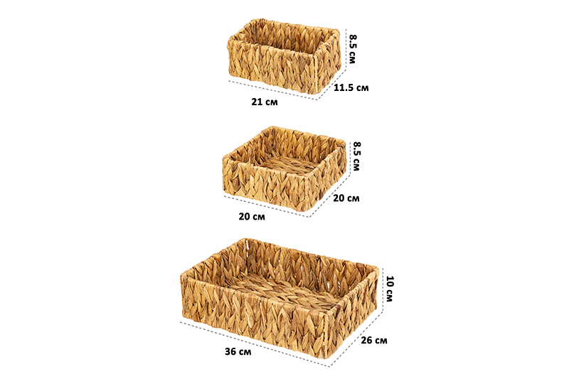 Набор состоит из 3-х плетеных корзин разного размера: 36х26х10 см, 20х20х8,5 см и 21х11,5х8,5 см. Корзины можно разместить на кухне, в прихожей, гостиной и любых других комнатах. Корзинки можно использовать для организации хранения и создания декоративных композиций в интерьере. Подойдут для хранения одежды (шапок, перчаток, белья, носков), канцелярии, косметики, рукоделия (пряжи, вязания) и других мелочей. Коробки имеют прочные стенки и дно. Их можно использовать для переноски вещей. Интерьерные плетеные корзинки помогут создать систему для хранения вещей в едином стиле или гардеробную систему в вашей прихожей!