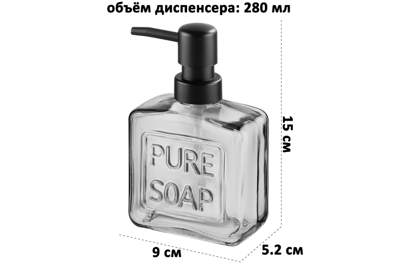 Диспенсер Elan Gallery "Серый" объёмом 280 мл и размером 9х5,2х15 см поможет организовать чистоту и уют в вашем доме. Выполнен из стекла и украшен надписью "Pure soap". Объём стеклянной бутылочки 280 мл позволит налить в неё достаточно средства, чтобы хватило для длительного использования. Дозатор диспенсера выполнен из пластика. Поскольку бутылка изготовлена из прозрачного стекла, вы можете контролировать уровень жидкости и вовремя пополнять её запас. Стильный органайзер подойдёт для использования на кухне или в ванной комнате. Налейте в него моющее средство, гель для мытья посуды или жидкое мыло. Эргономичная форма позволяет разместить флакон с дозатором на раковине или полке. В ванной можете использовать его для геля для душа или шампуня. Универсальную бутылочку с дозатором можно приспособить под антисептик. Просто поставьте её на стол, чтобы средство для дезинфекции было всегда под рукой. Ёмкость квадратной формы выполнена в стильном дизайне и подойдёт для любого интерьера. Инструкция: не применять абразивные моющие средства. Избегать регулярного прямого контакта с водой (например, не хранить в душевой кабинке или на полке возле душа). Поставляется в картонной упаковке. Настольный диспенсер — это не только практичное, но и стильное решение для организации чистоты и порядка в вашем доме.