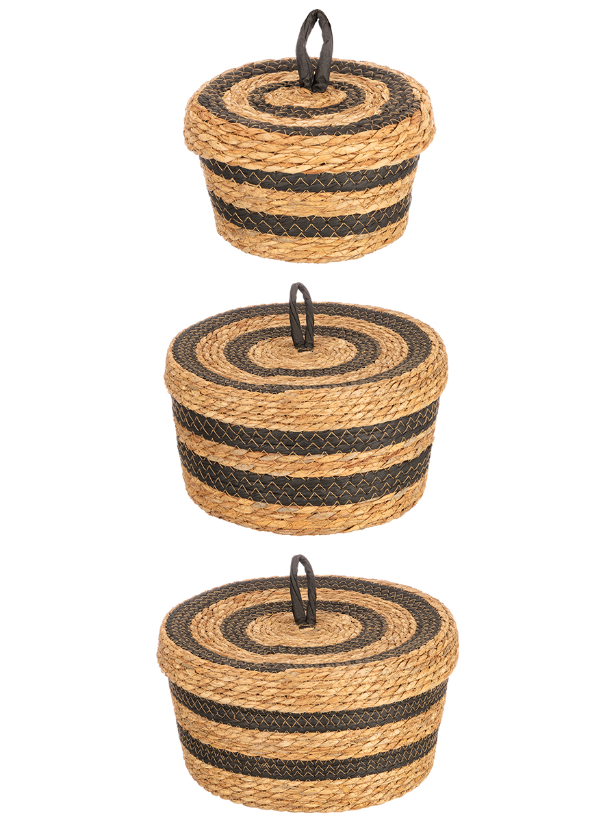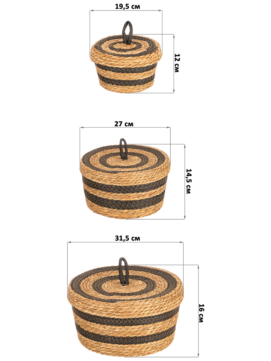 БЫЛО 2920 руб! Набор 3 плетеных корзин 19,5*19,5*12 см, 27*27*14,5 см, 31,5*31,5*16 см, с крышкой, водный гиацинт