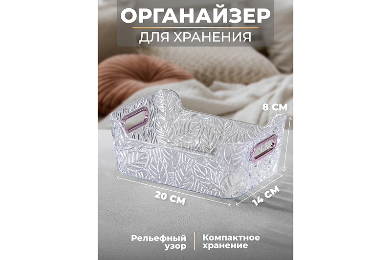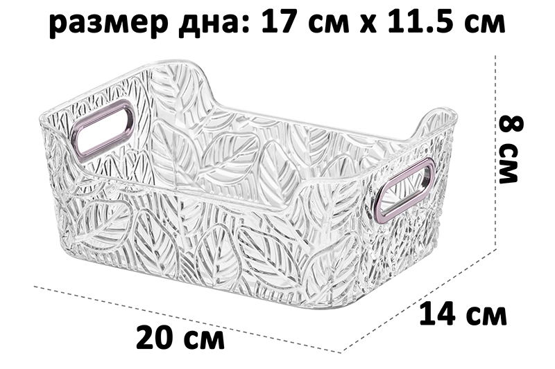 Органайзер для хранения от ELCASA поможет вам эстетично и эффектно поддерживать в доме порядок! Размер изделия – 20х14х8 см, размер дна – 17х11,5 см. Изготовлен из пластика. Прозрачная ёмкость украшена рельефным лиственным узором и оснащена металлическими ручками лилового цвета. Благодаря лаконичному дизайну она гармонично дополнит интерьер любой комнаты и найдёт место в разных частях вашего дома. В спальне заполните изделие ватными дисками, ушными палочками или другими средствами уходовой косметики. В прихожей используйте её для ключей, носовых платков или перчаток. На кухне контейнер позволит компактно хранить наборы для специй и приправ, салфетки или столовые принадлежности. Используйте настольный ящик в качестве офисного аксессуара, чтобы держать под рукой необходимые документы или канцелярию. Разместите его на туалетном столике для флаконов с духами, лаков для ногтей или предметов декоративной косметики. Практичные ручки облегчат переноску изделия. Не рекомендуется применять абразивные моющие средства. Не подходит для использования в посудомоечной машине. В коллекции бренда ЭЛЬКАСА представлены разнообразные товары для дома, которые привнесут в ваш быт практичности и стиля.
