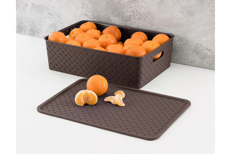 Корзина с крышкой от ELCASA имеет тёмно-коричневый цвет. Размер изделия – 35х24,5х10,5 см, объём – 7,5 литра. Размер дна – 32,5х21,5 см. Универсальный дизайн и благородный цвет добавят стиля вашему интерьеру. Органайзер выполнен из полипропилена и станет незаменимым помощником для организации порядка в гардеробной, в комнате или на кухне. Преимущество данного материала над обычным пластиком заключается в его лёгкости и безопасности для здоровья. Используйте пластиковый контейнер для хранения как овощей и фруктов, так и кухонных и хозяйственных принадлежностей. Храните в ней косметику, бытовую химию или моющие средства, расположив в шкафчике или на открытом пространстве. Декоративное плетение с отверстиями обеспечивает циркуляцию воздуха и предотвращает порчу продуктов от недостатка кислорода. Удобные ручки облегчат перенос даже наполненного изделия. Крышка надёжно защитит содержимое от попадания грязи и пыли. Корзину можно использовать для белья, полотенец, одежды и различных мелочей. Поставьте короб под раковину в ванной, возле стиральной машины или на полку. Разместите в детской комнате в качестве ящика для игрушек. Храните в ней садовые инструменты или используйте в гараже, на складе или на балконе под разнообразный инвентарь. Подойдёт для компактной перевозки вещей в багажнике машины. Не рекомендуется применять абразивные моющие средства. В ассортименте бренда ЭЛЬКАСА представлены корзинки разных объёмов, форм и цветов, что позволит собрать уникальный набор, отвечающий вашим потребностям. Создайте систему хранения в едином стиле и эффективно используйте каждый сантиметр пространства!
